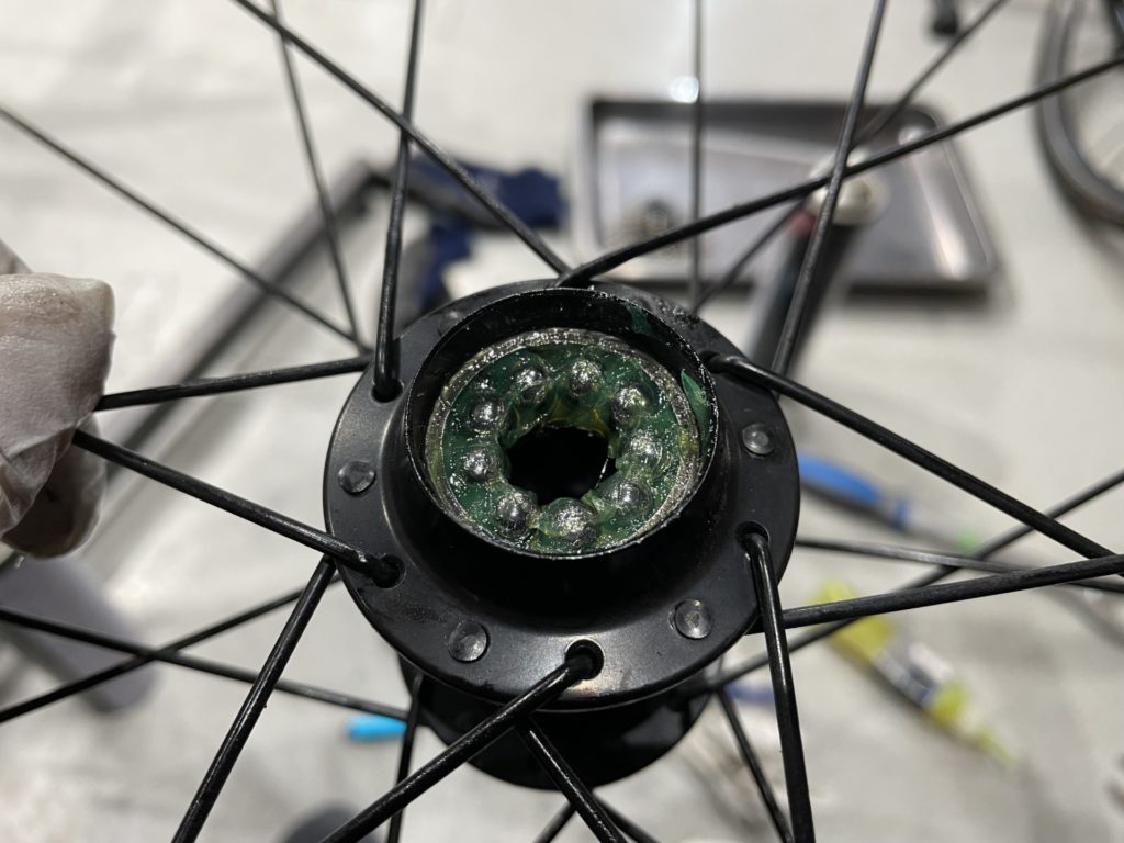 お客様はShimano製のホイールを使用されており、今までハブ内のグリスアップをされたことがなかった為、ハブのオーバーホール作業を行いました。オーバーホールによる定期的なクリーニングとグリスアップは内部のボールベアリングおよび玉押しの寿命を延ばし、ホイールの回転性能を維持します。
