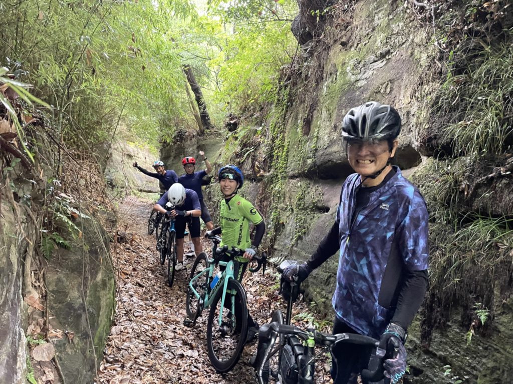 現代でもこのような道が残っている鎌倉は凄いですね、ちなみに地面はつるっとした岩肌に両脇が土と枯葉で埋まっています。しかも今日は台風で岩肌が濡れている、間違ってもSPD SLシューズで歩く場所ではない…