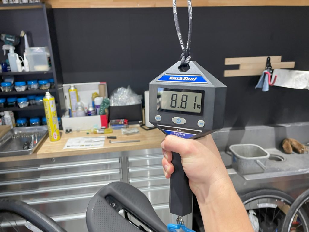 ベース車体の状態からパーツ変更なし・ペダルなしの状態での車体重量は8.81㎏でした。