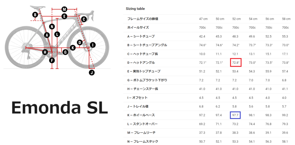 またホイールベースに関してもDomaneの方が2cm以上長いことが分かります。(画像の青枠、Domaneは100.3cm、Emondaは97.7cm)