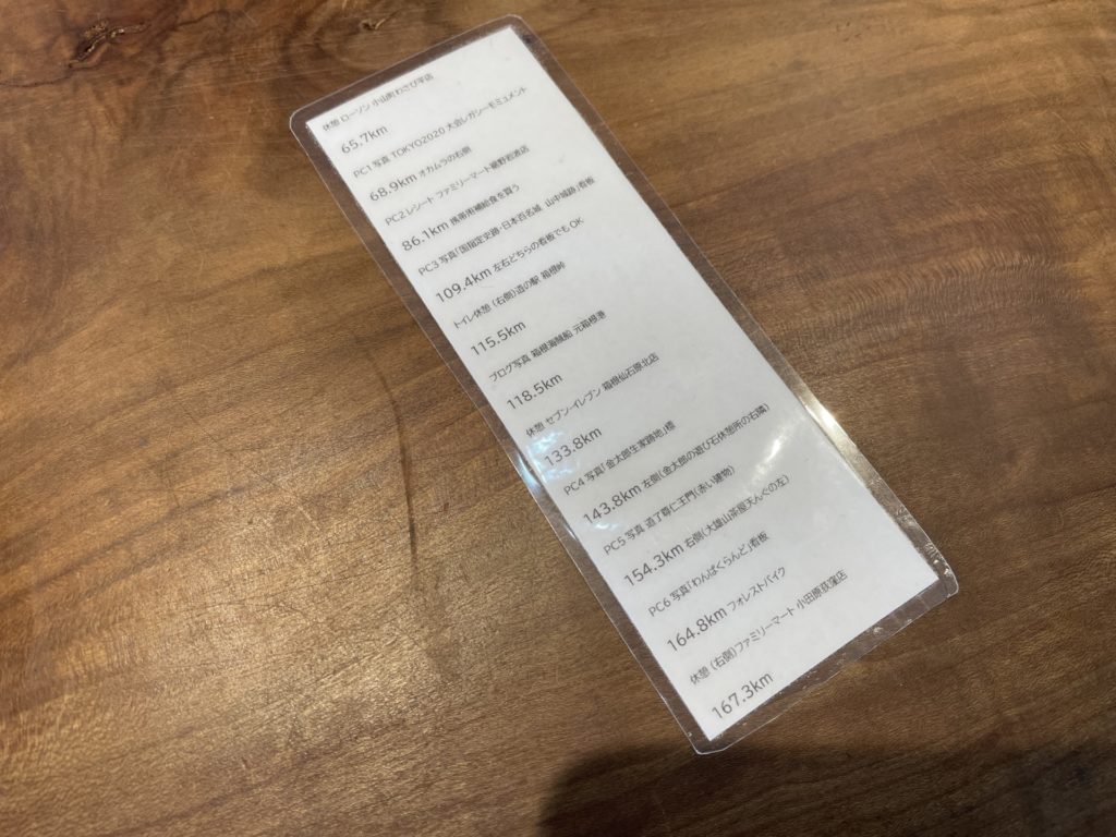 加えてキューシートとRide with GPSでのPCの距離がズレていたため、次の目的地までの距離をこの紙を見ながら走りました。