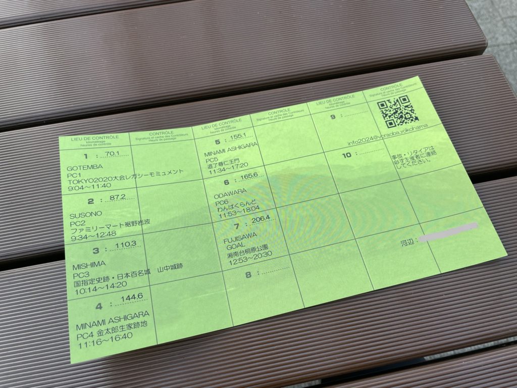 裏面には今回のチェックポイント(PC:Point de Contrôle)とその確認欄、DNFや走行中のトラブルに遭った際の主催への連絡先が載っています。