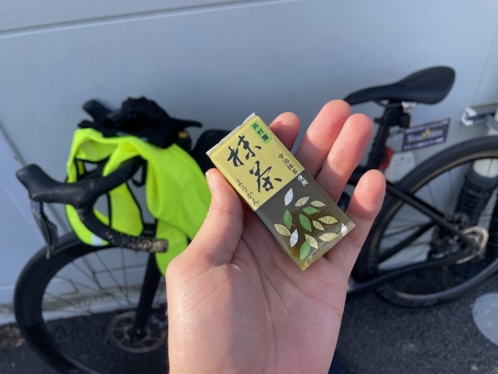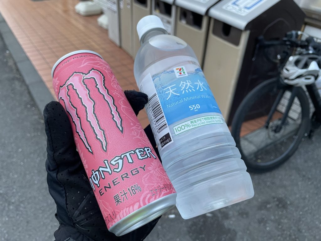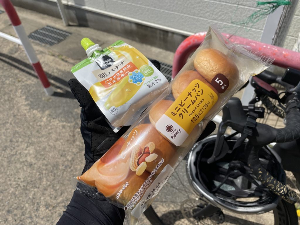 ちなみにこのコンビニの少し手前のコンビニでも補給で止まり、おにぎりを食べたため、ここでは飲みやすいゼリー飲料を飲んでピーナッツパンはこの後の峠でエネルギー不足にならないよう携帯しておくことに。