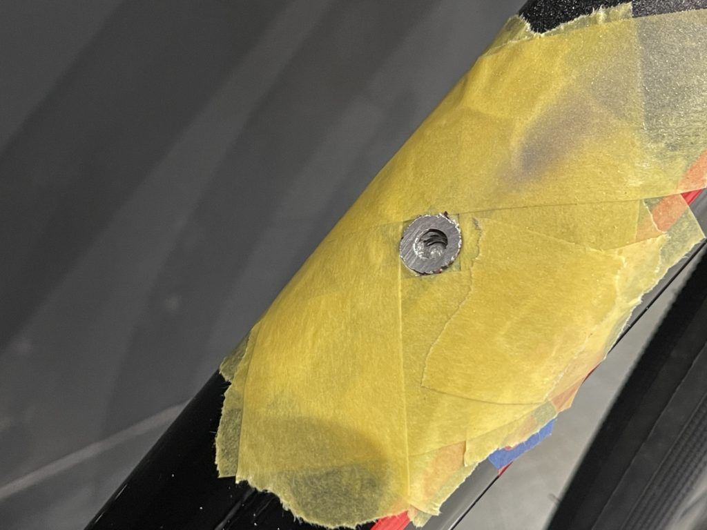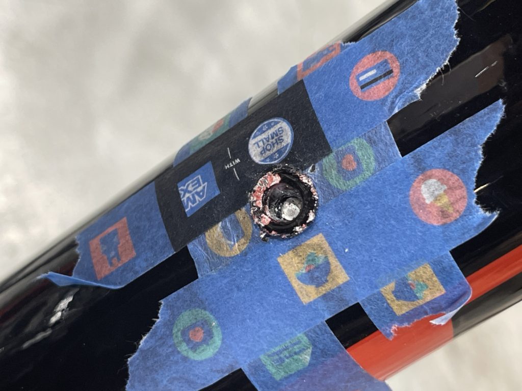 その際にフレームに傷が入らないようにリベットの鍔とフレームが接する面やその周辺にマスキングすることで、綺麗に施工が可能になります。