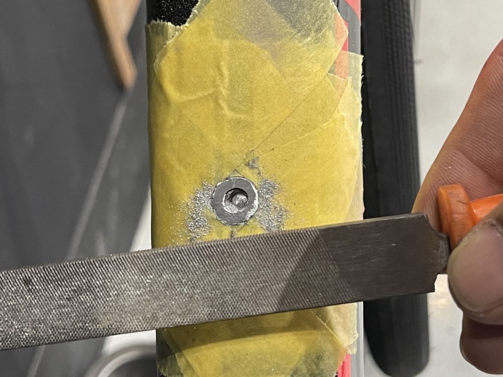 フレームの表側で広がっているリベットの鍔を削り落としていきます。