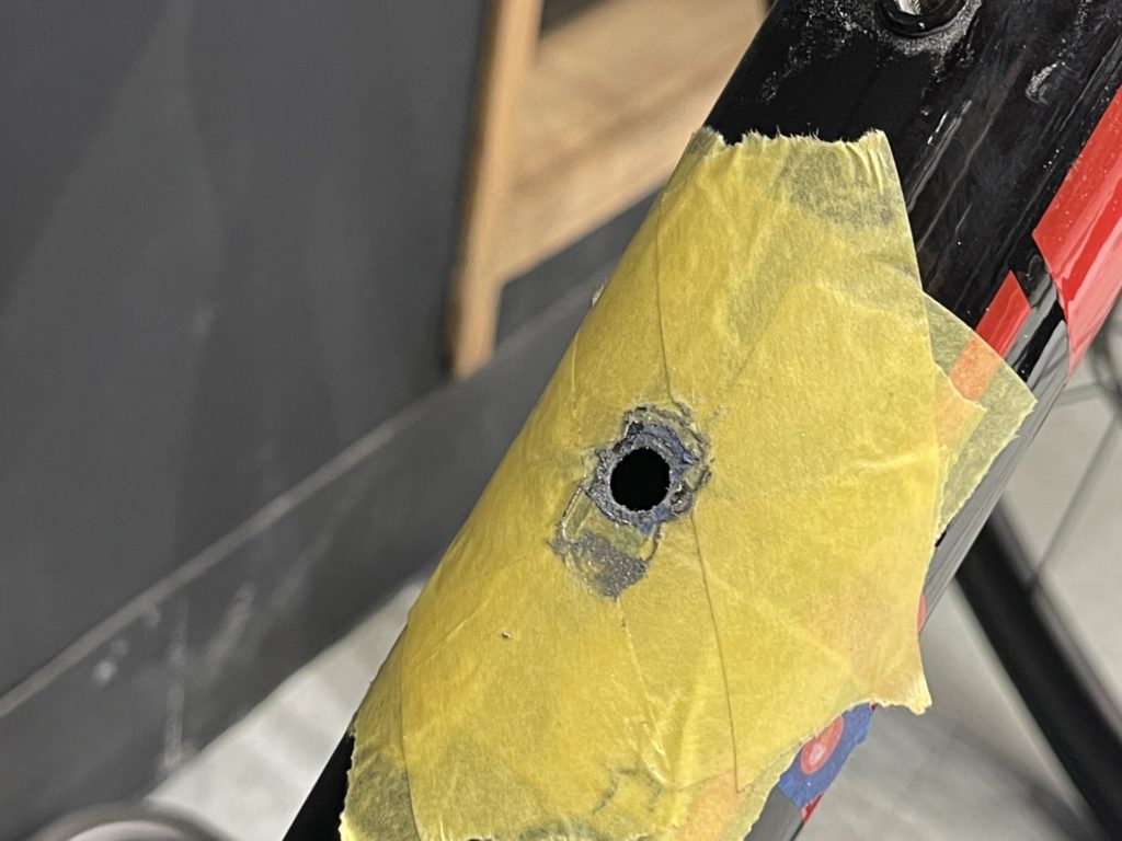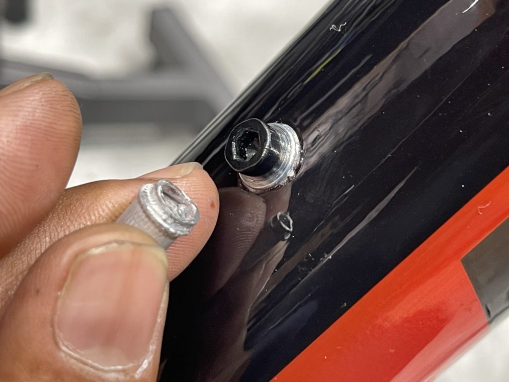 自身でボトルケージを取り付けようとしたところ、ボルトが斜めに入っていることに気が付かず、そのまま強く締めてしまい、ボトルケージが固定される前にリベットが耐え切れずに固定部の緩みに至った様子です。
