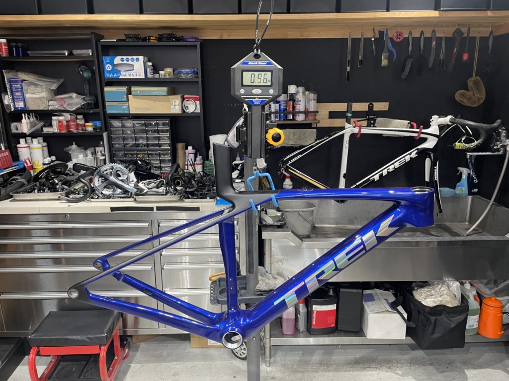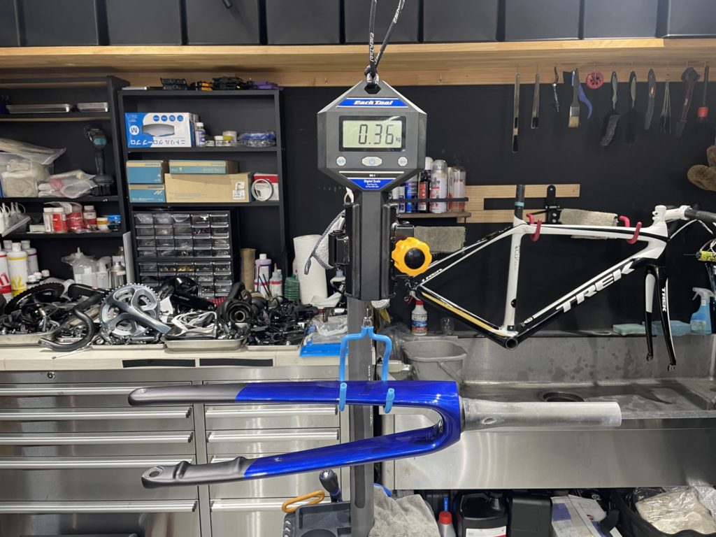 組み立て前に実測重量を計測したところ、Madone SL GEN XSサイズのフレーム重量は960g、フォーク重量は360gでした。