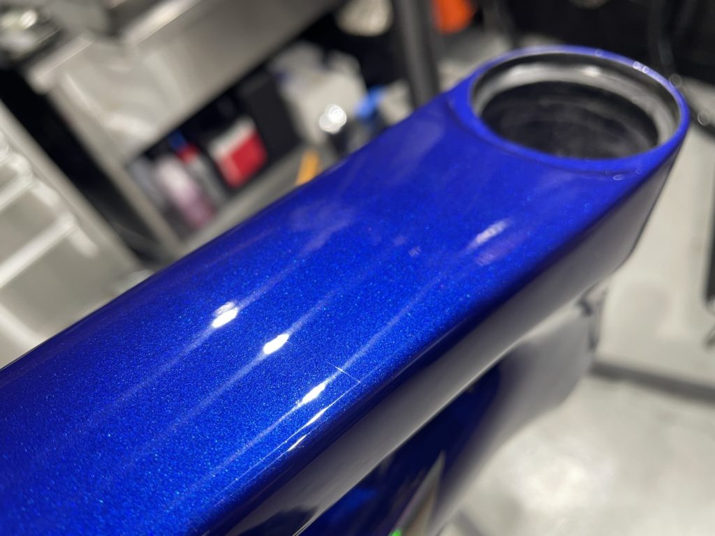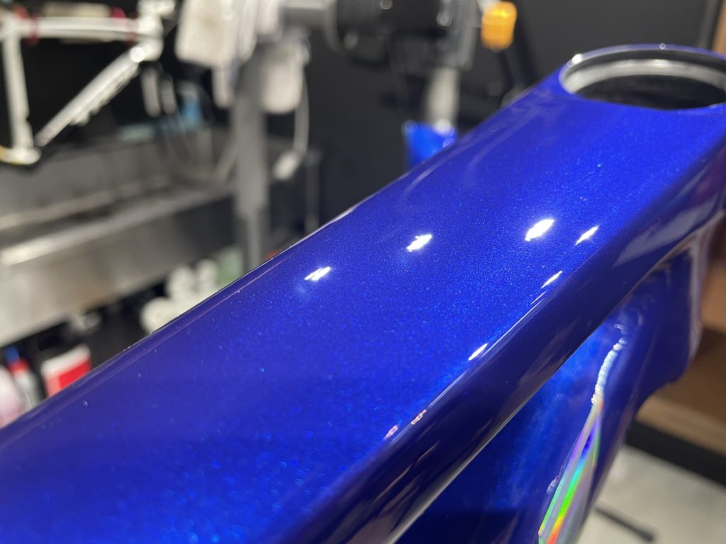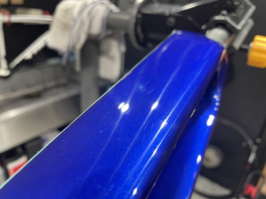 その際、特殊な研磨機具を用いて梱包材等により付いたフレームの微細な傷を研磨し磨き上げ、傷のない綺麗な塗装の上からガラスコーティングを施工します。