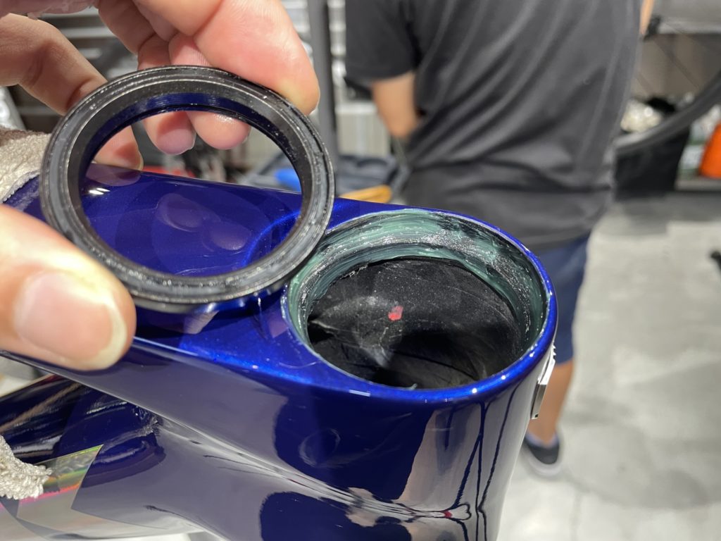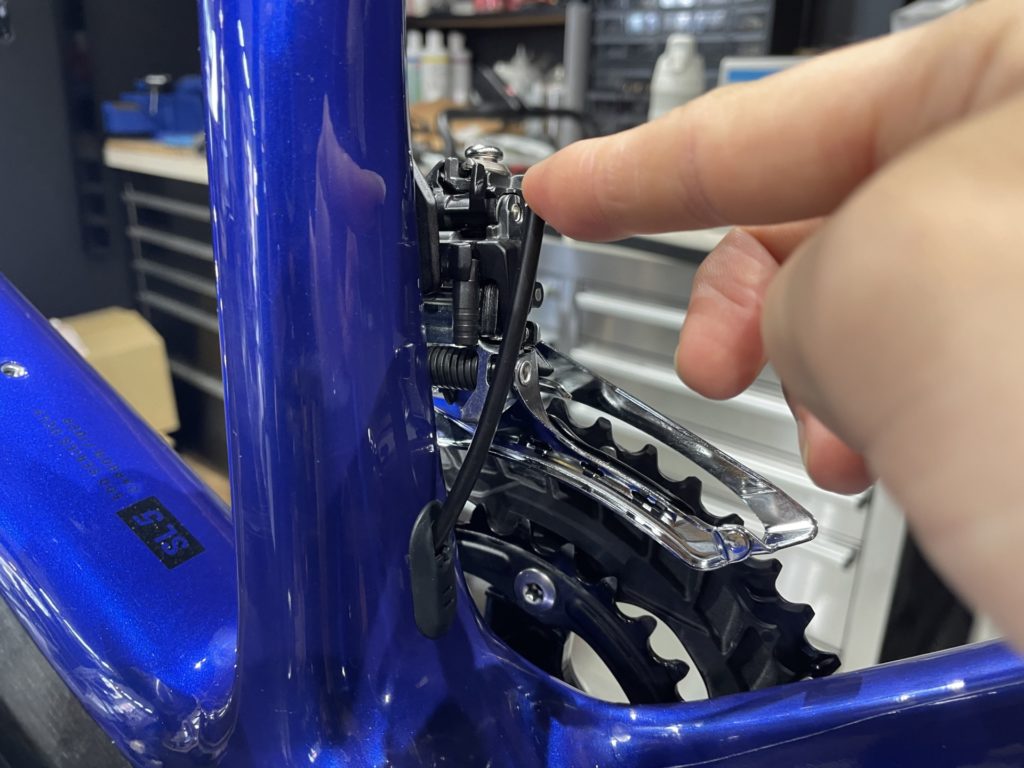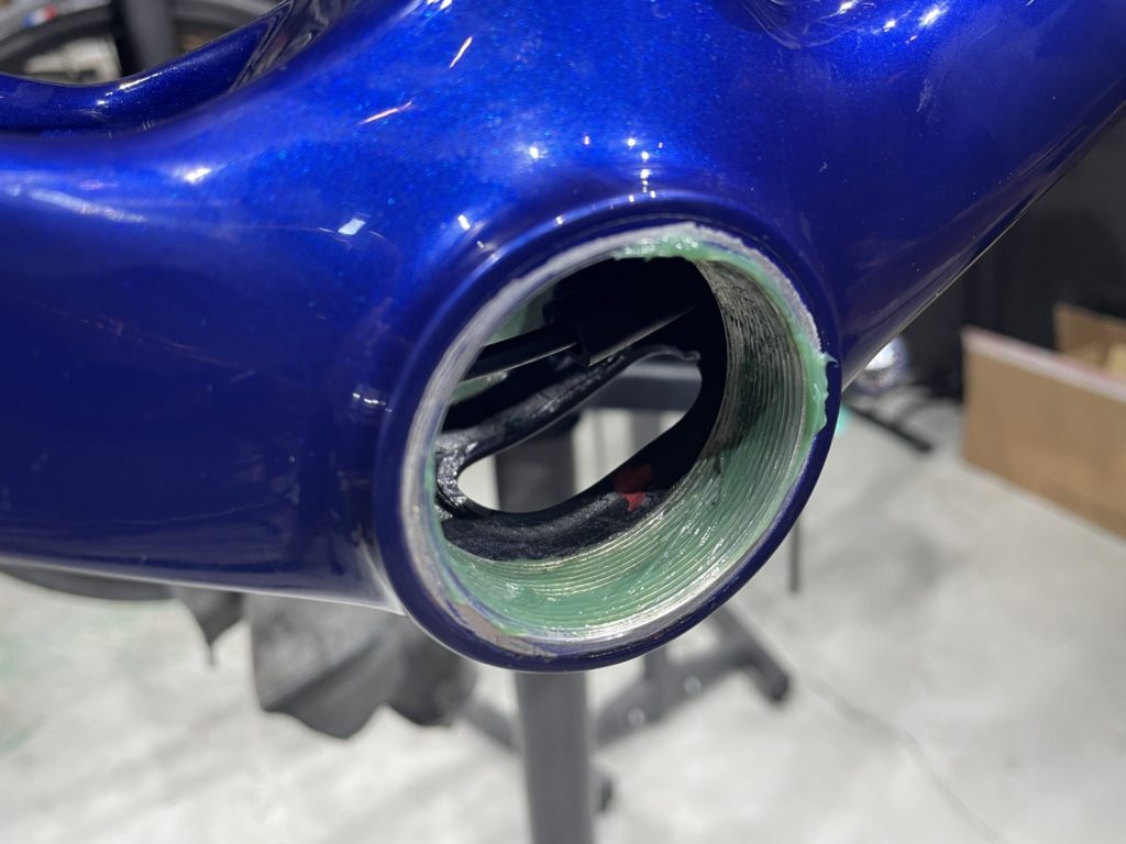 組み上げるにあたりここ最近のケーブルフル内装モデルはステム付近までケーブルが内装される為、ハンドルを大きく切るとケーブルがフレーム内部で引っ張られます。そのため、フレーム内に弛ませるためのケーブル長を考慮した上で組む必要があります。