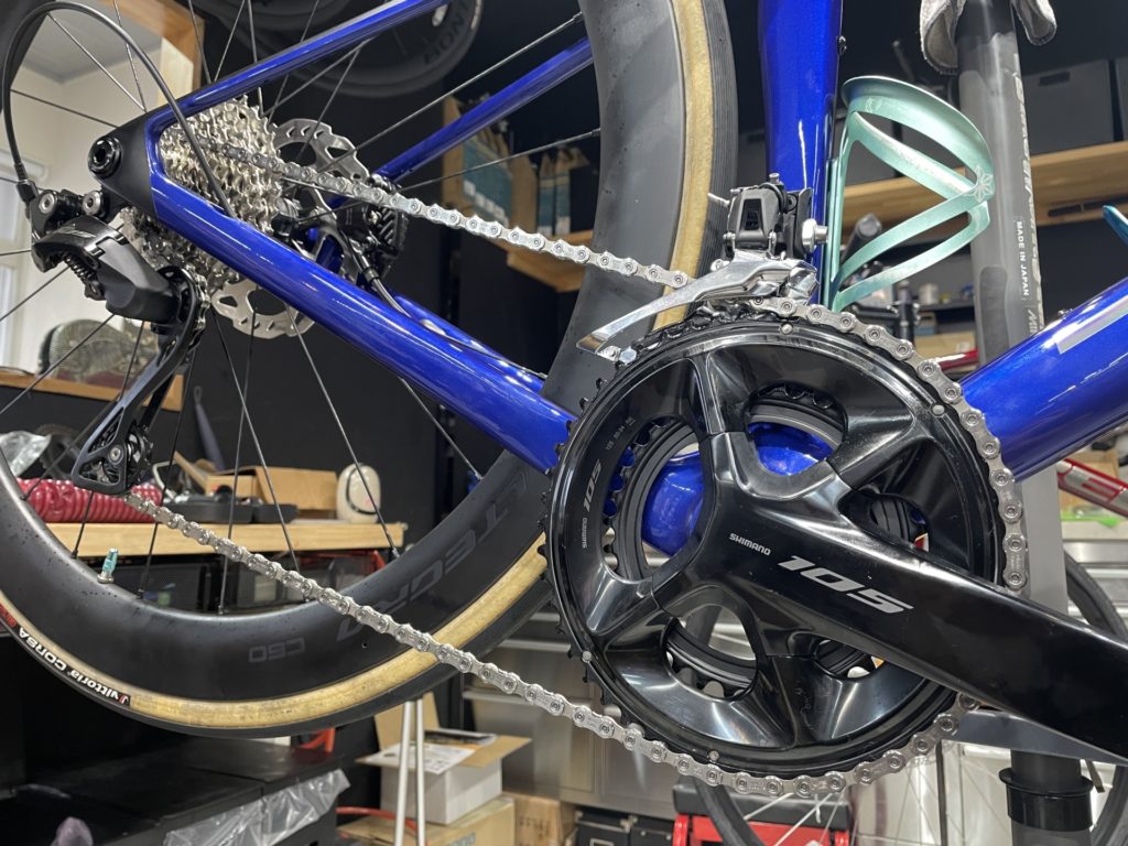 完成車にShimano ULTEGRAカーボンホイールやBontrager Aero Pro Roadハンドルバーを初めから組み込み、2種類のフレームコーティングをかけ、過去に当店で受けられたフィッティングデータを元にポジションも合わせることでお客様に合わせた最適な仕様にてご納車させていただきました。