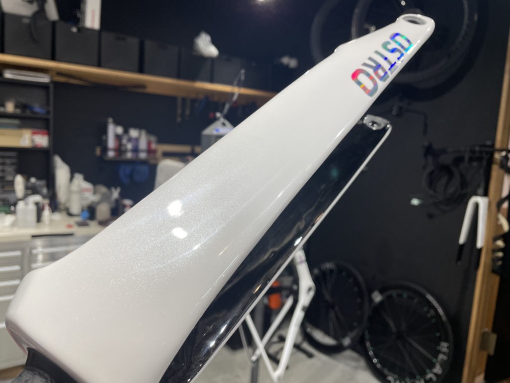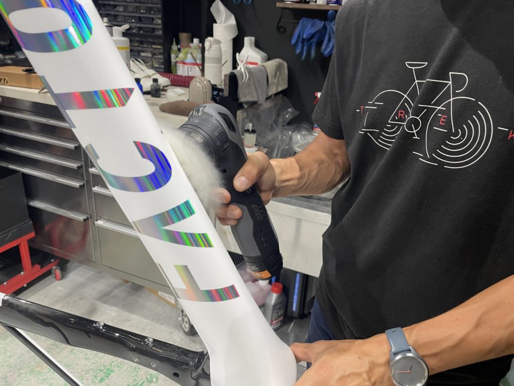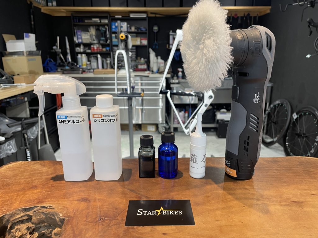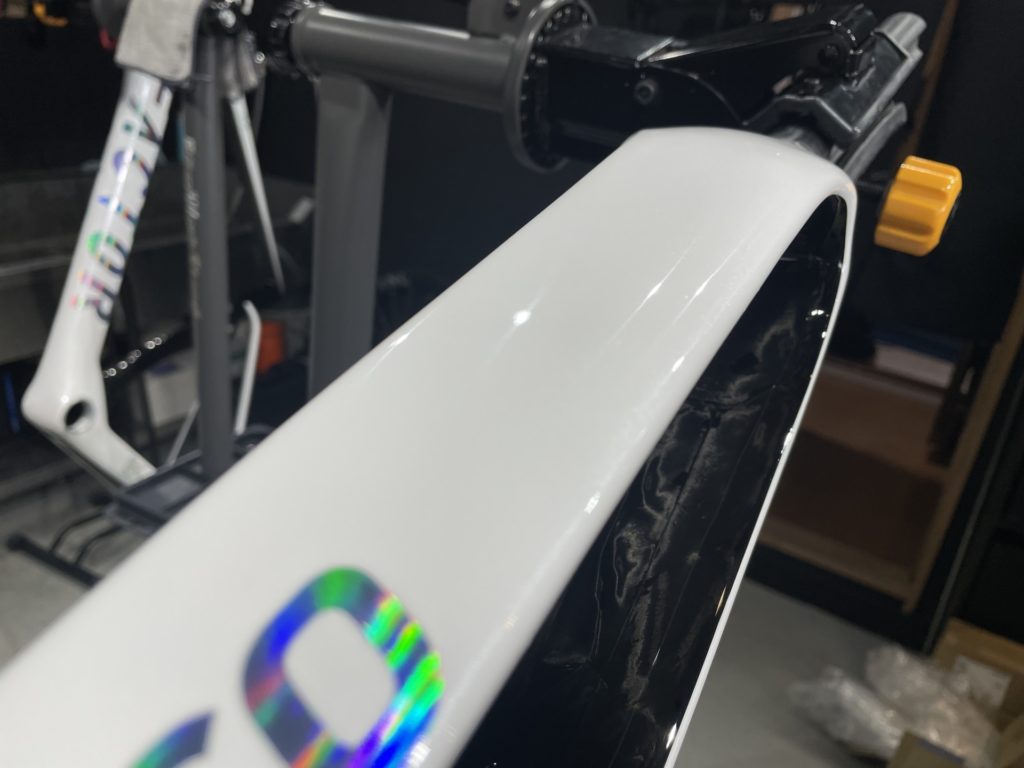 今回はパーフェクト組立に伴いフレームにクレストヨンド社のガラスコーティング「ガラスの鎧」と「カミナリの鎧」のコーティングをフレームとホイールにかけ、ご納車させていただきました。