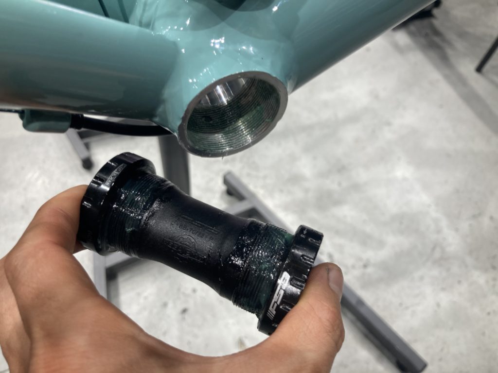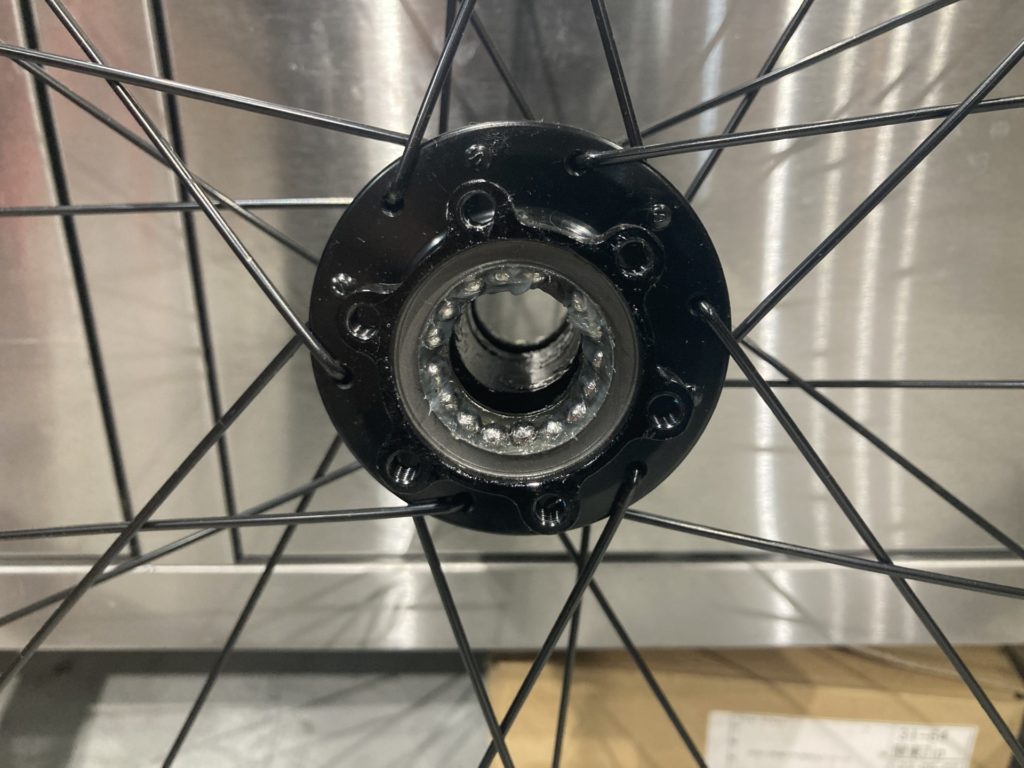 ホイールはベアリングの状態を確認するために分解。工場でのグリスが少なかったり、グリスの劣化が見られた場合はこちらで再塗布を行います。またカップアンドコーン式ベアリングの際は回転性能の向上とベアリングボールの摩耗を最小限に抑えるために丁寧に玉押し調整を行います。