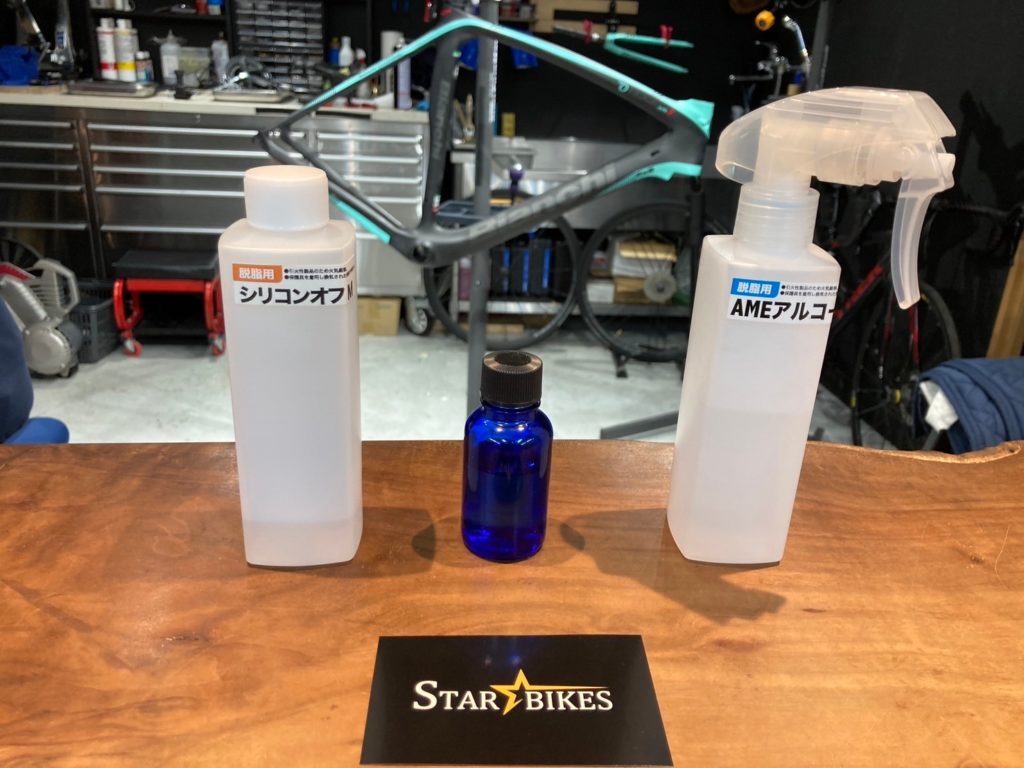 クレストヨンド社によるガラスの鎧(青色の瓶)、カミナリの鎧(黒色の瓶)と専用の研磨機(右端) STAR☆BIKESでは車体購入時やオーバーホール受付時にフレームへのコー...