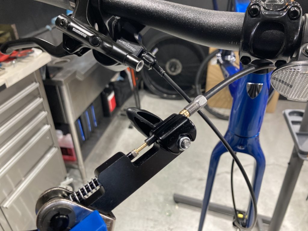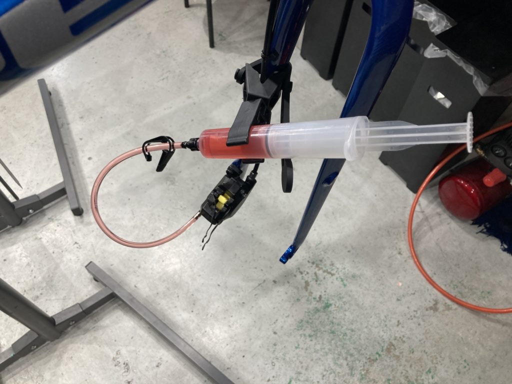 油圧ディスクブレーキの場合、ホース再接続後にブリーディング作業(オイル交換)を行います。