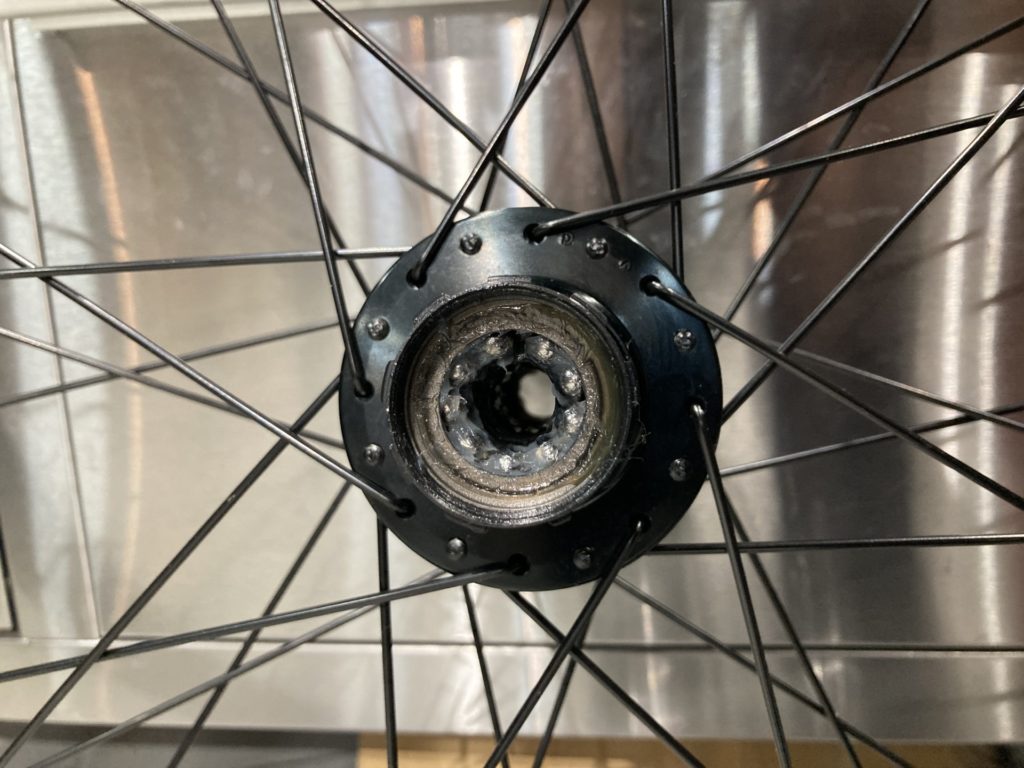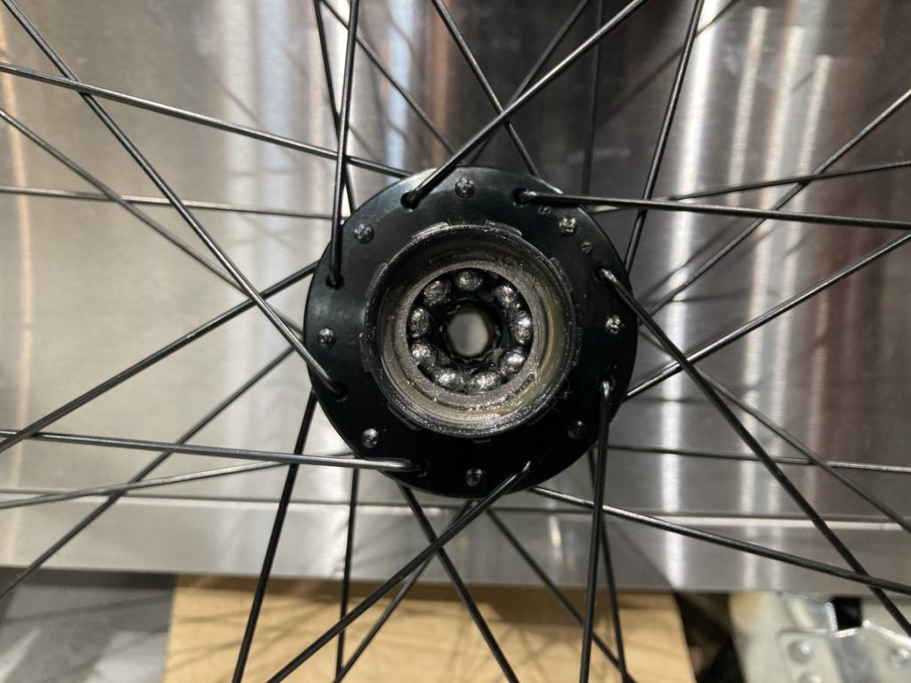 ホイールはベアリングの状態を確認するために分解。工場でのグリスが少なかったり、グリスの劣化が見られた場合はこちらで再塗布を行います。またカップアンドコーン式ベアリングの際は回転性能の向上とベアリングボールの摩耗を最小限に抑えるために丁寧に玉押し調整を行います。