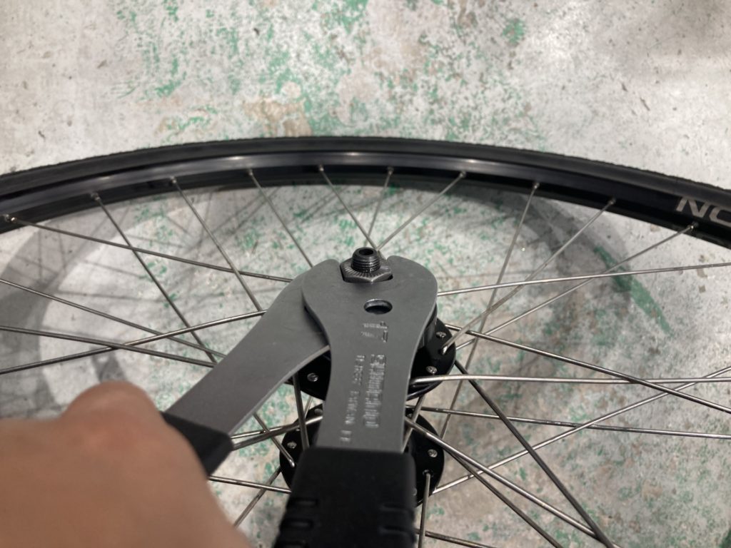 ホイールはベアリングの状態を確認するために分解。工場でのグリスが少なかったり、グリスの劣化が見られた場合はこちらで再塗布を行います。またカップアンドコーン式ベアリングの際は回転性能の向上とベアリングボールの摩耗を最小限に抑えるために丁寧に玉押し調整を行います。