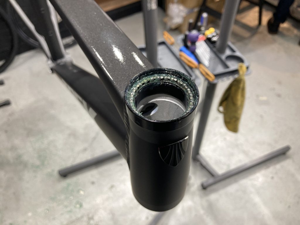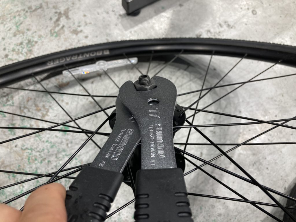 ホイールはベアリングの状態を確認するために分解。工場でのグリスが少なかったり、グリスの劣化が見られた場合はこちらで再塗布を行います。またカップアンドコーン式ベアリングの際は回転性能の向上とベアリングボールの摩耗を最小限に抑えるために丁寧に玉押し調整を行います。
