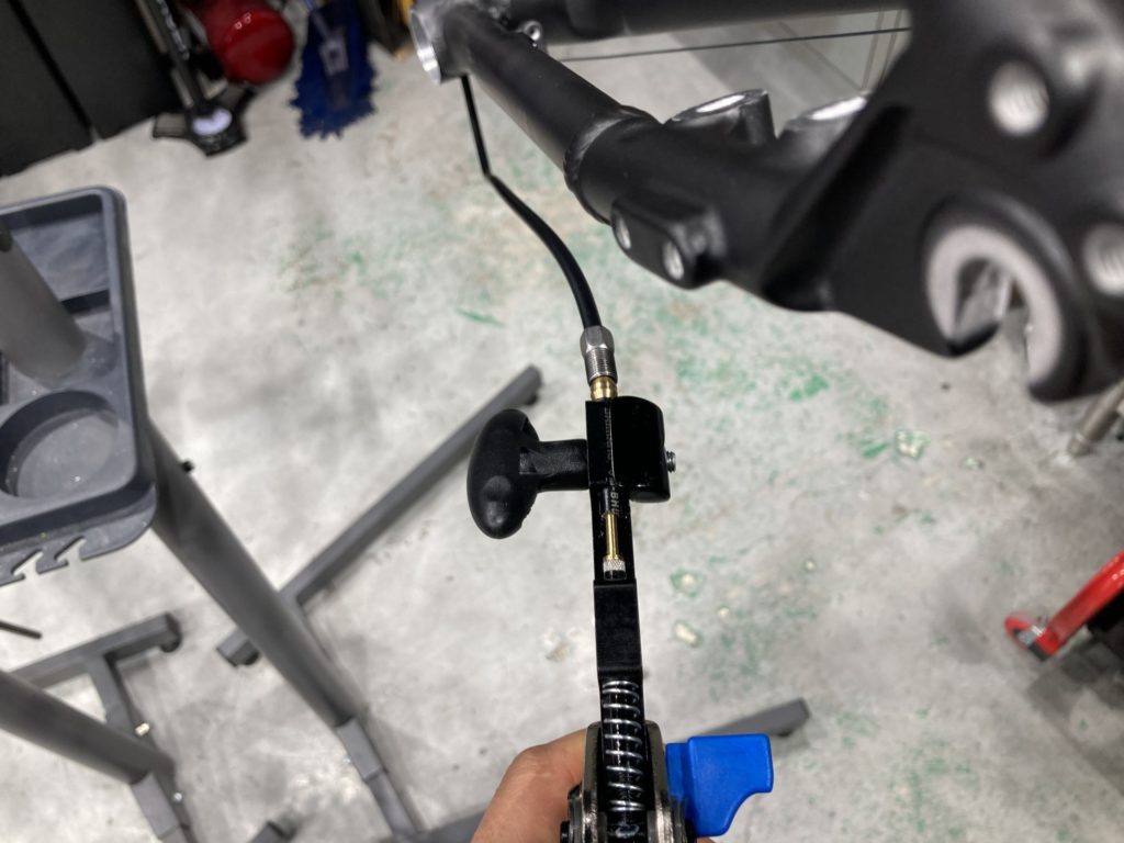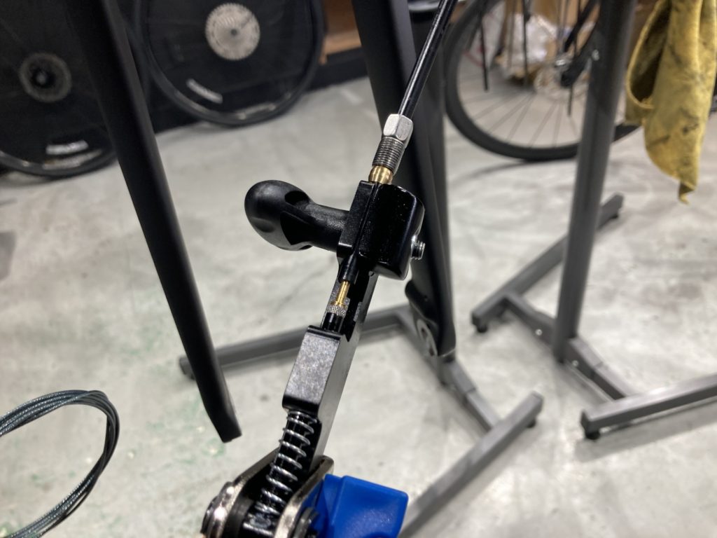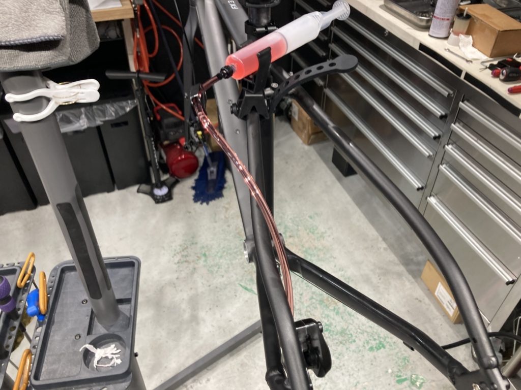 油圧ディスクブレーキの場合、ホース再接続後にブリーディング作業(オイル交換)を行います。