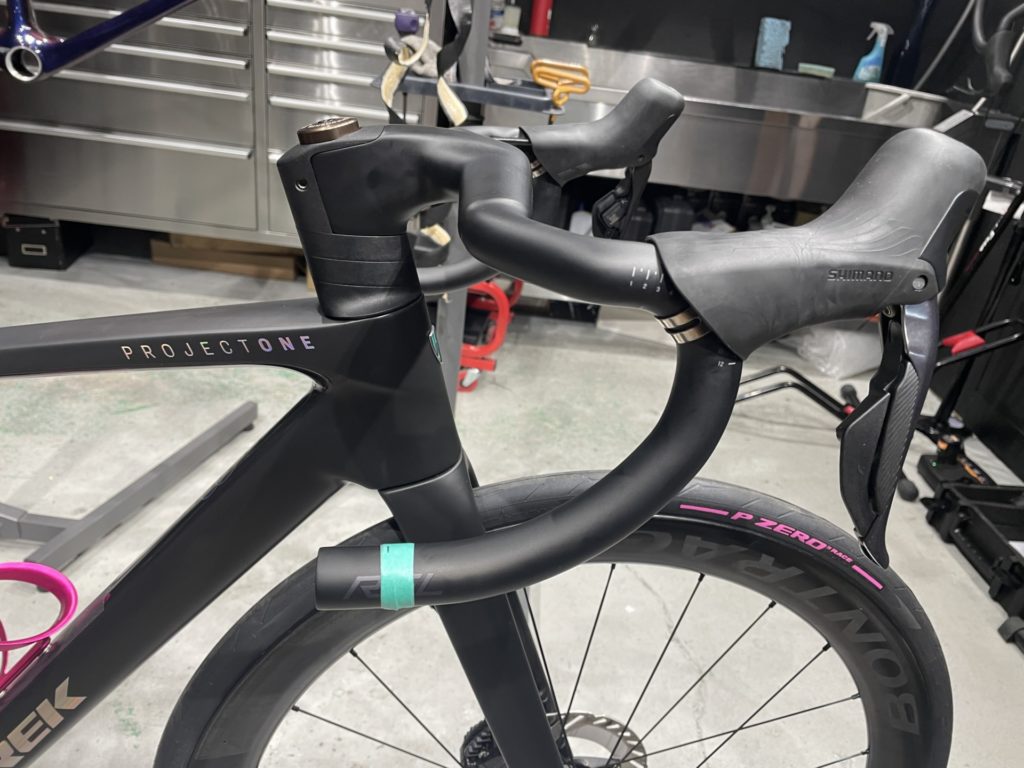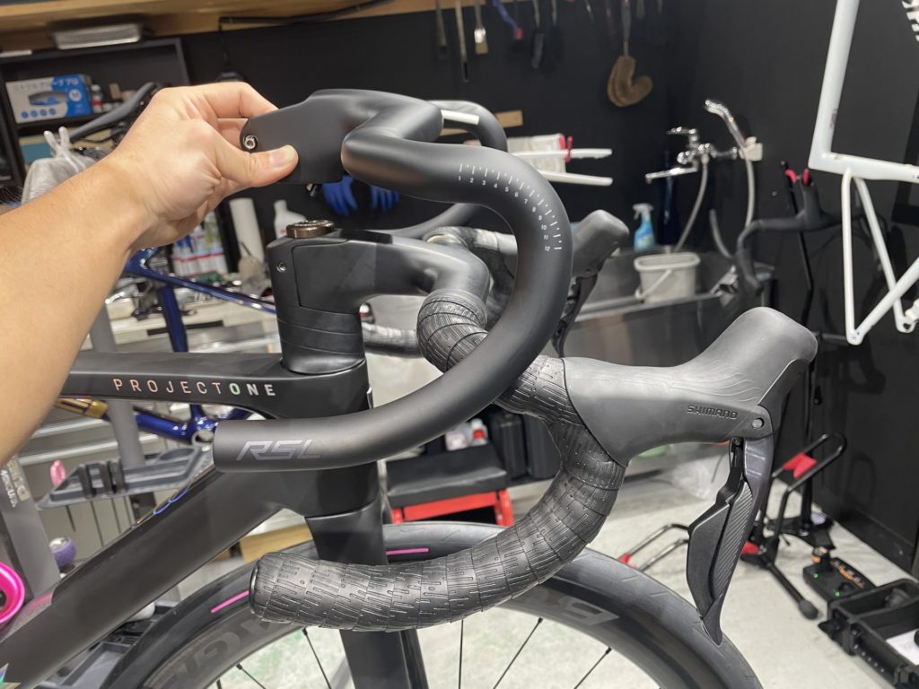 これが結果大成功。ヘッドチューブの先端ギリギリぐらいにバーエンドが来ているのでダンシングやスプリントしても膝が当たることはなく、下ハンドルを握ってもまったく気になりません。