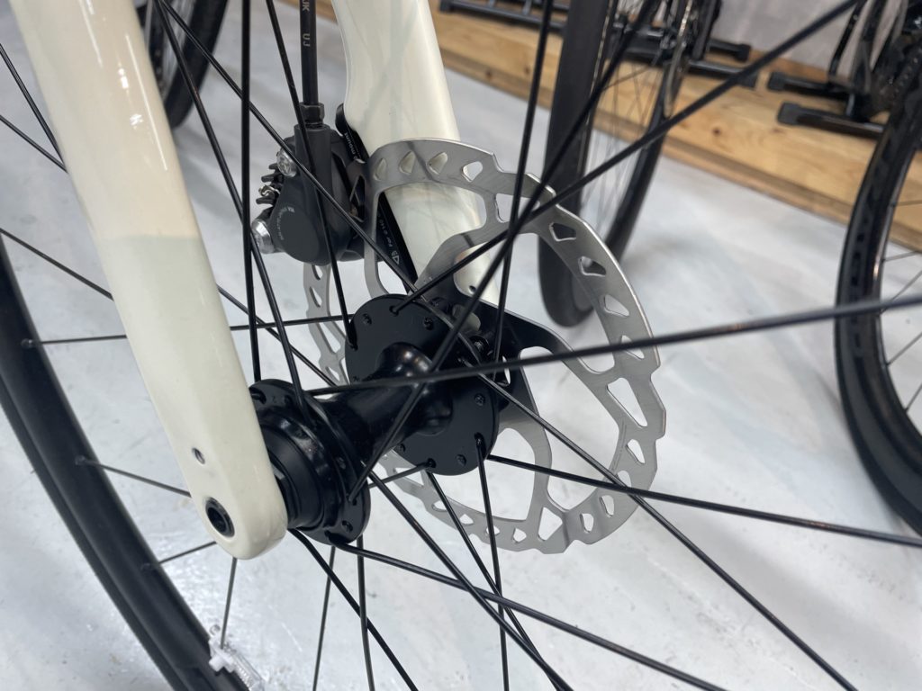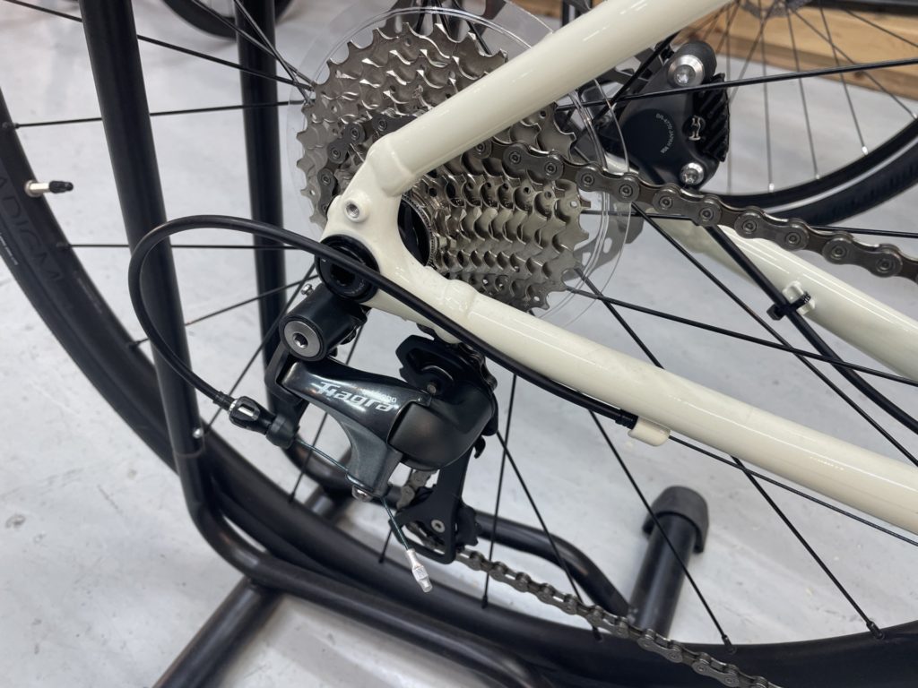 リアのカセットスプロケットは11-32tが付いており、フロントの50/34tとの組み合わせでロードバイクとして軽いギア比で登り坂も充分こなせますが、これでも辛いという場合には最大で11-34tに交換しフロント:リア=34t:34tの1対1の仕様にもできます。