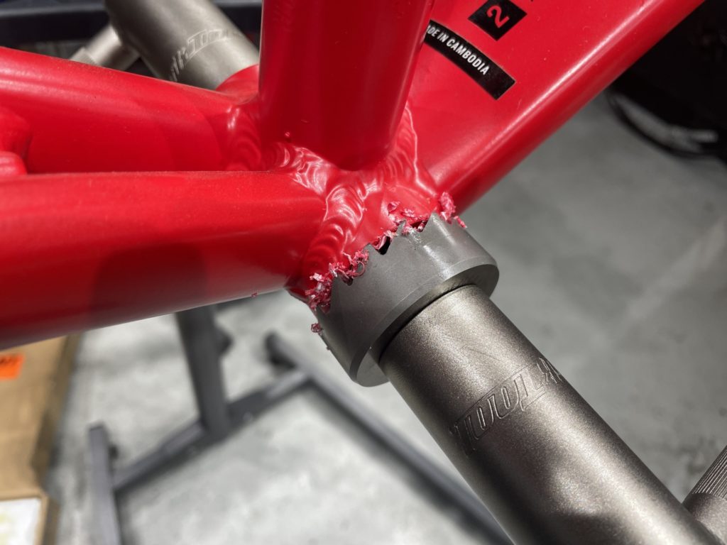 フレーム側の塗装の厚みに応じてBBの取付精度が変わるため、事前にタッピングおよびフェイシング作業を行ってから組付けを行います。