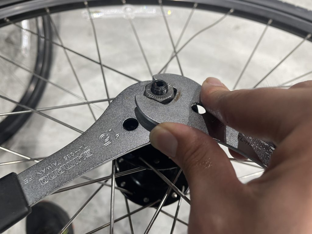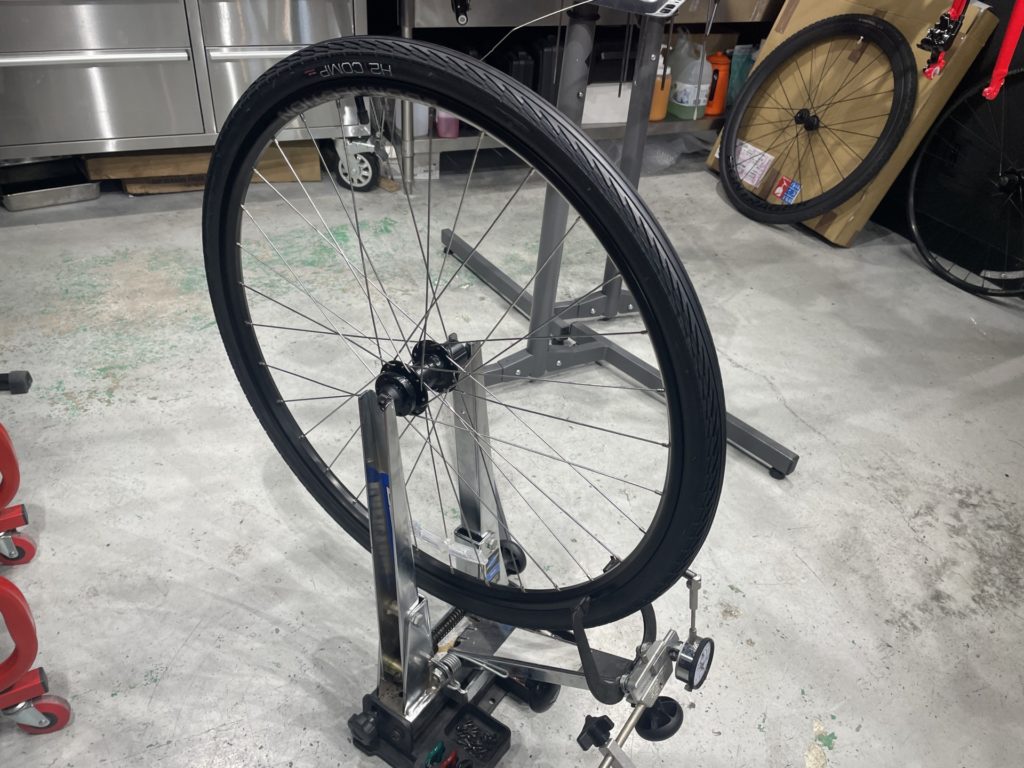 工場組立のホイールはベアリングのチェックと併せてカップ&コーン式であれば組付け時の調整で回転性能の引き上げを行い、リムの振れ調整やスポークのテンション調整を行います。