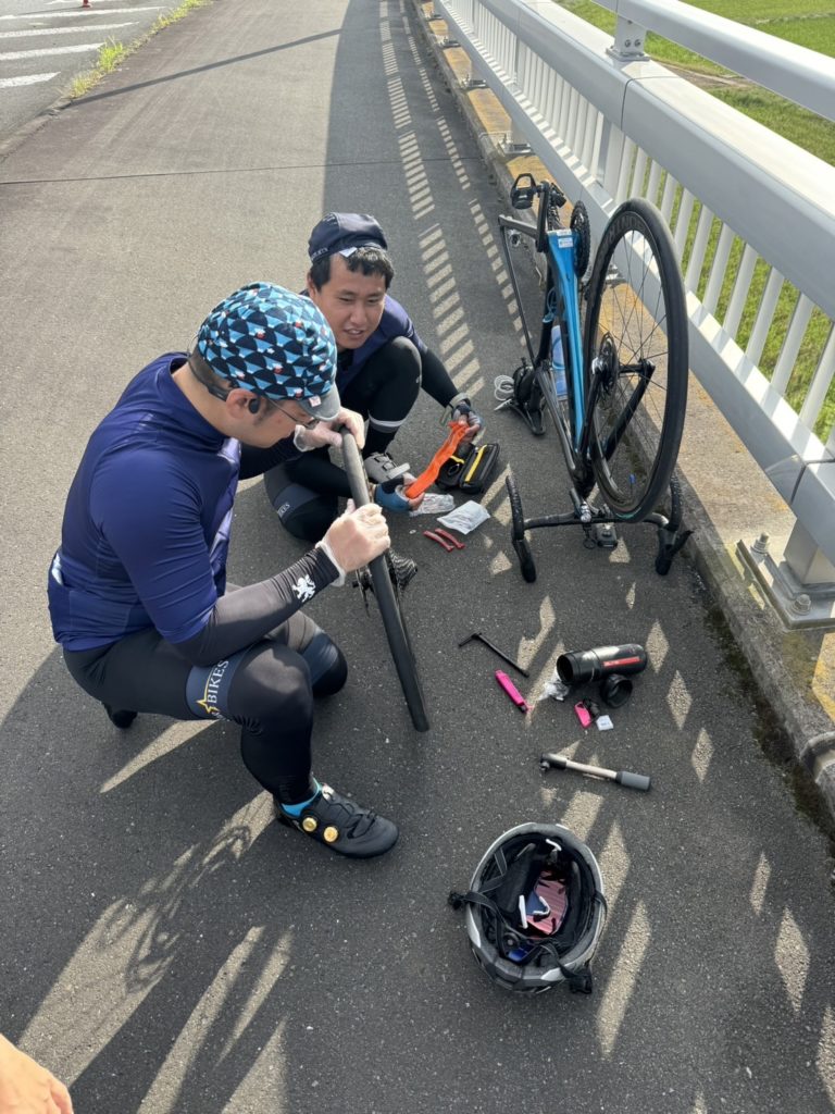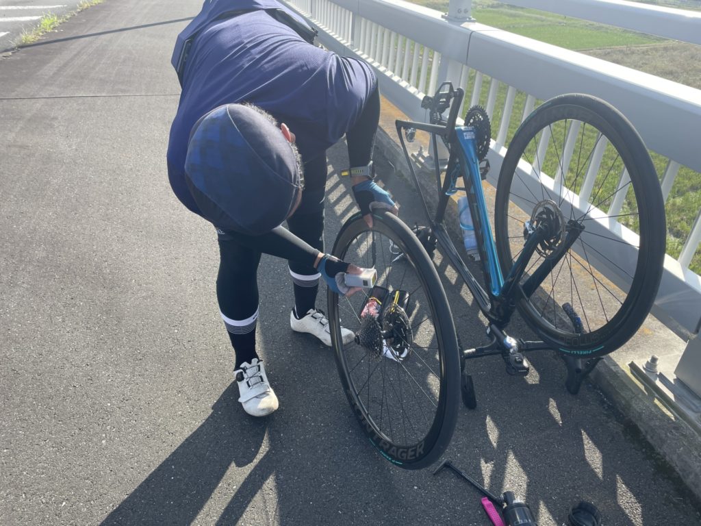 早速その場でパンク修理を行います。