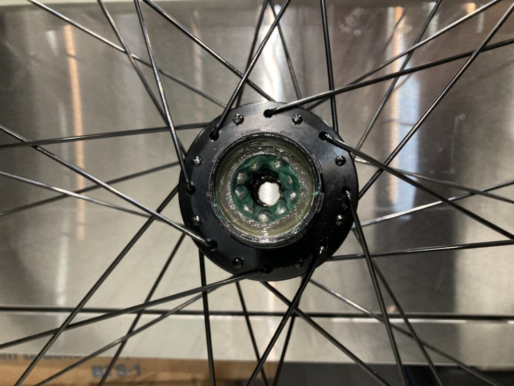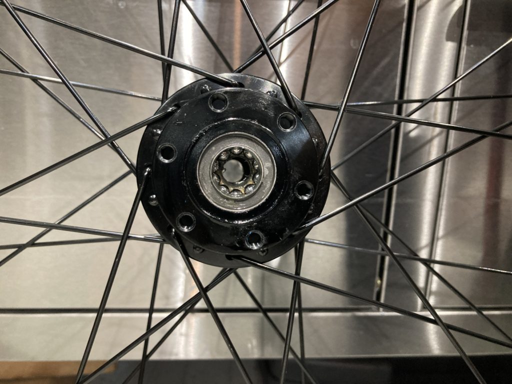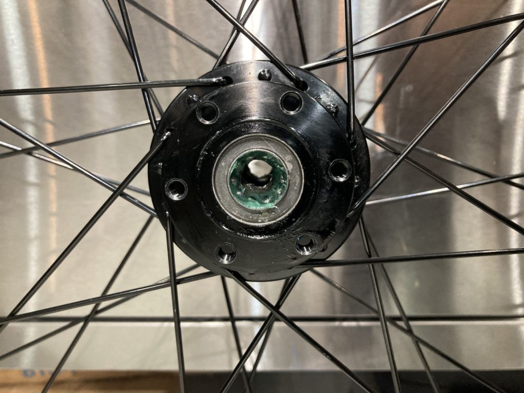 ホイールはベアリングの状態を確認するために分解。工場でのグリスが少なかったり、グリスの劣化が見られた場合はこちらで再塗布を行います。またカップアンドコーン式ベアリングの際は回転性能の向上とベアリングボールの摩耗を最小限に抑えるために丁寧に玉押し調整を行います。