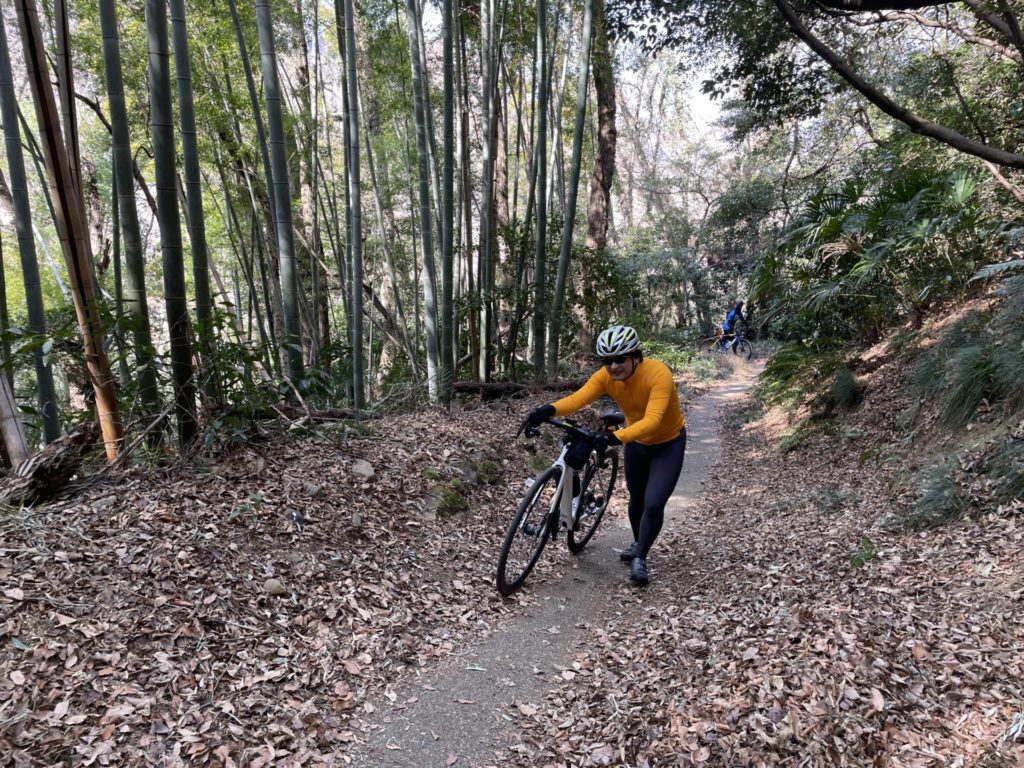 入口から竹林までは路面が土になっていますが、その先に進むと人が通れるだけの狭い舗装路が登場し、つづら折りに登っていくことができるのですが、自転車に乗車して登るには相応のテクニックが必要となります。