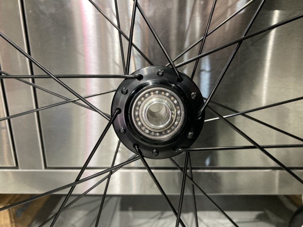 ホイールはベアリングの状態を確認するために分解。工場でのグリスが少なかったり、グリスの劣化が見られた場合はこちらで再塗布を行います。またカップアンドコーン式ベアリングの際は回転性能の向上とベアリングボールの摩耗を最小限に抑えるために丁寧に玉押し調整を行います。