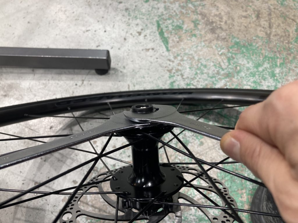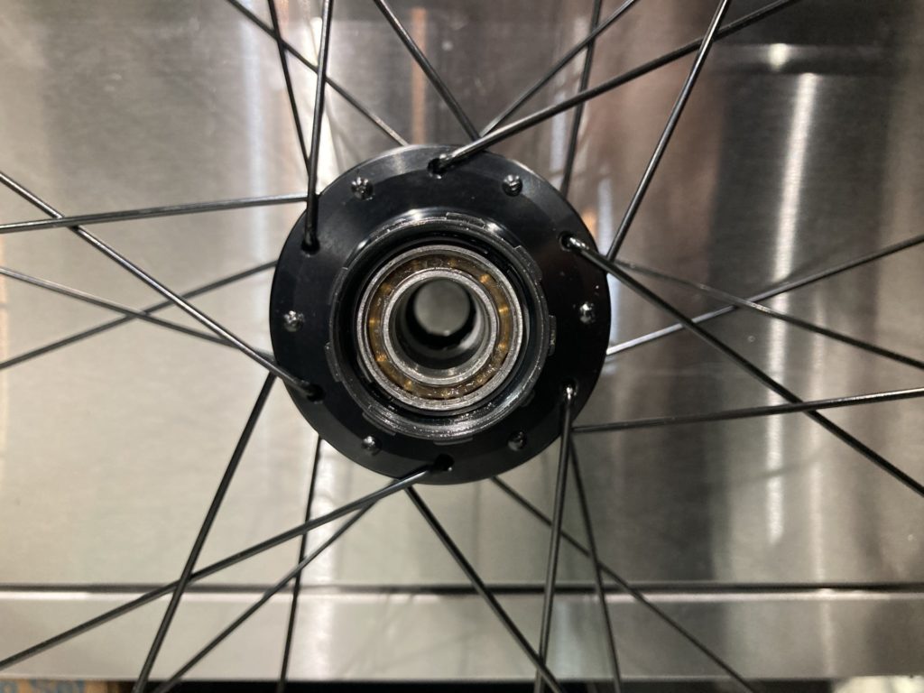 ホイールはベアリングの状態を確認するために分解。工場でのグリスが少なかったり、グリスの劣化が見られた場合はこちらで再塗布を行います。またカップアンドコーン式ベアリングの際は回転性能の向上とベアリングボールの摩耗を最小限に抑えるために丁寧に玉押し調整を行います。