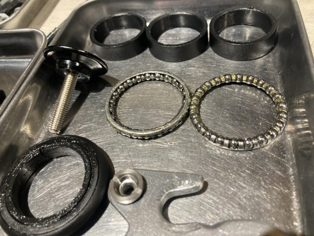ホイールはベアリングの状態を確認するために分解。工場でのグリスが少なかったり、グリスの劣化が見られた場合はこちらで再塗布を行います。またカップアンドコーン式ベアリングの際は回転性能の向上とベアリングボールの摩耗を最小限に抑えるために丁寧に玉押し調整を行います。
