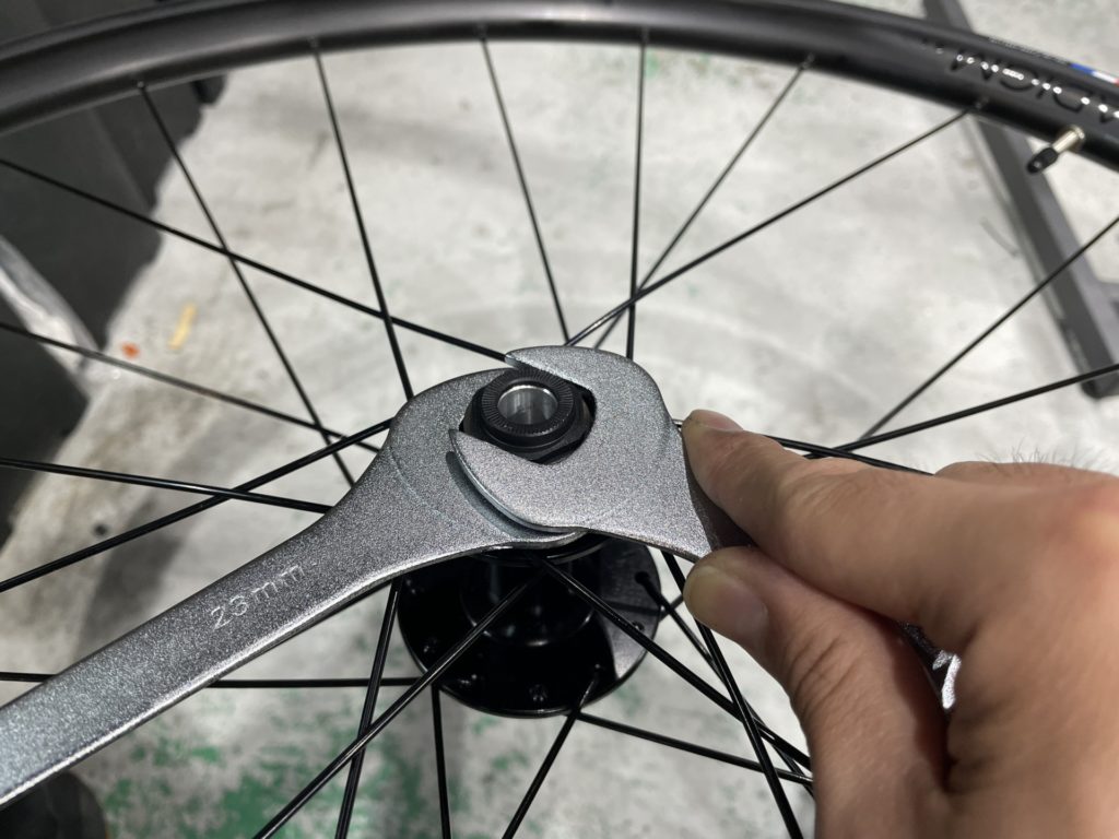 ホイールはベアリングの状態を確認するために分解。工場でのグリスが少なかったり、グリスの劣化が見られた場合はこちらで再塗布を行います。またカップアンドコーン式ベアリングの際は回転性能の向上とベアリングボールの摩耗を最小限に抑えるために丁寧に玉押し調整を行います。