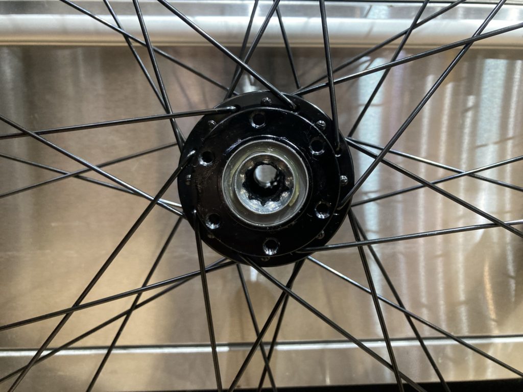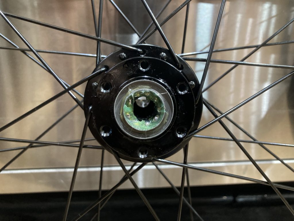 ホイールはベアリングの状態を確認するために分解。工場でのグリスが少なかったり、グリスの劣化が見られた場合はこちらで再塗布を行います。またカップアンドコーン式ベアリングの際は回転性能の向上とベアリングボールの摩耗を最小限に抑えるために丁寧に玉押し調整を行います。