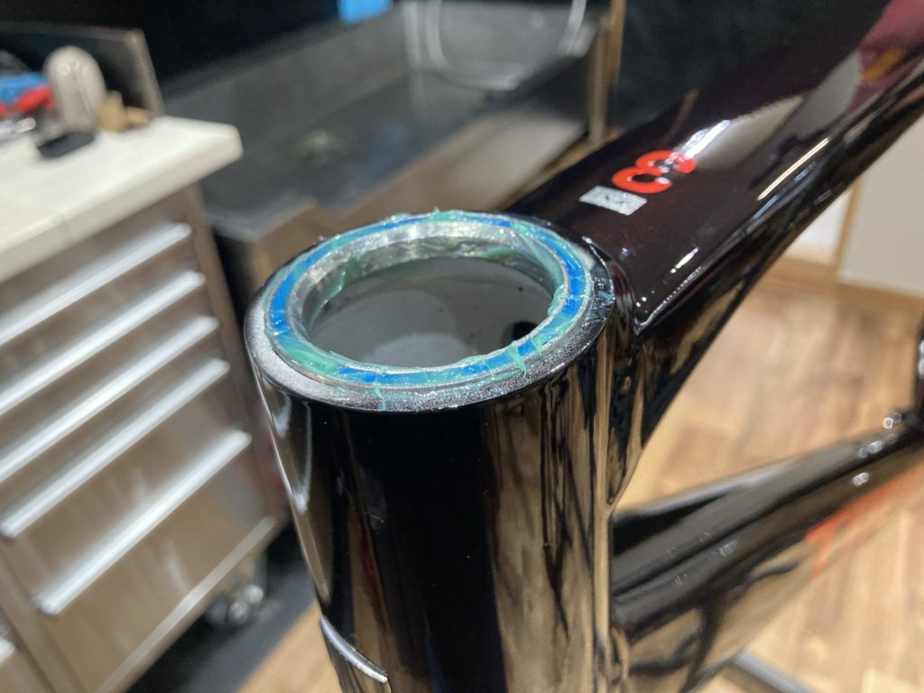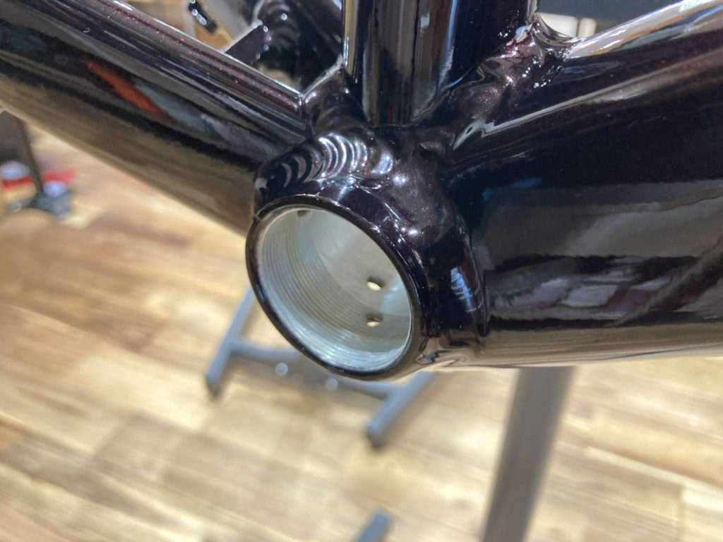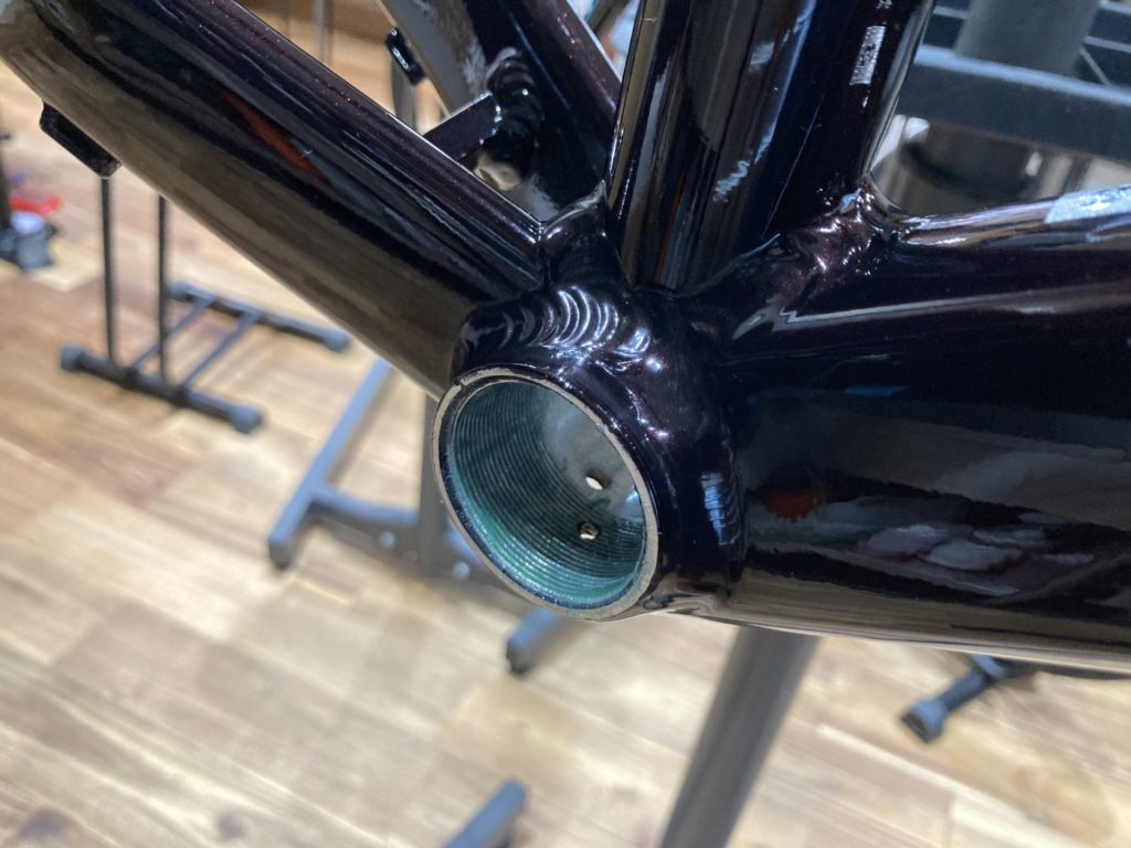 各コンポーネントを分解後はフレームのBB受けから調整します。ドライブトレイン側とノンドライブ側にボトムブラケットの取付精度を高めるため、タッピングとフェイシング加工を行っています。 また水分が入り込みやすい場所であるため、錆に強いグリスを塗布し取付を行います。