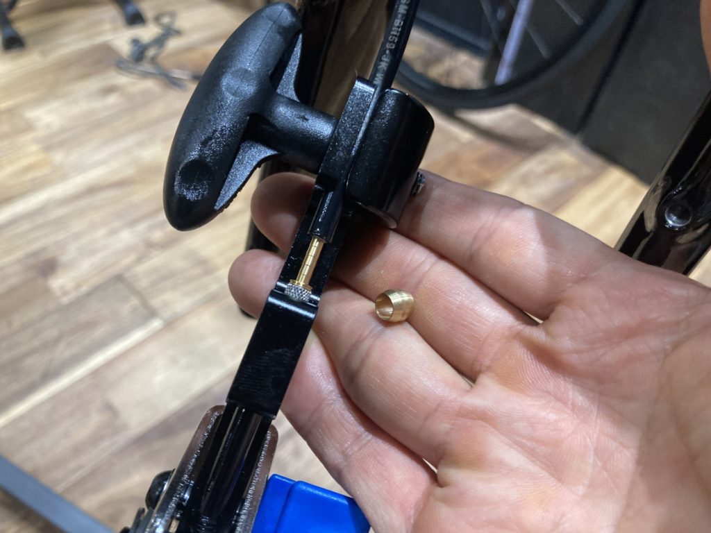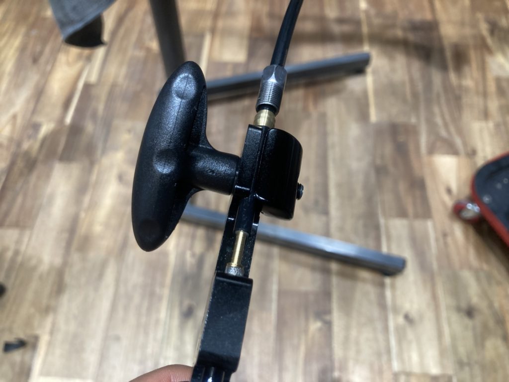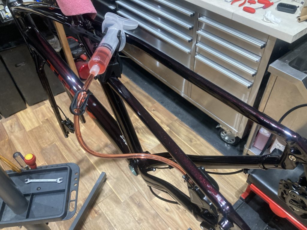油圧ディスクブレーキの場合、ブリーディング作業(オイル交換)を行います。