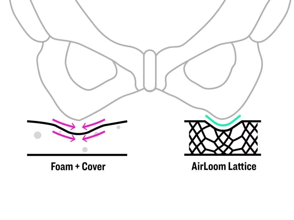 フォーム素材のサドルで圧力が一カ所にかかると、表面のカバーに引っ張られてサドル全体が歪んでしまいます。ラティスサドルにはカバーがなく、部位ごとに独立して圧縮される構造のため、身体の各部位に合わせたサポートが実現できます。