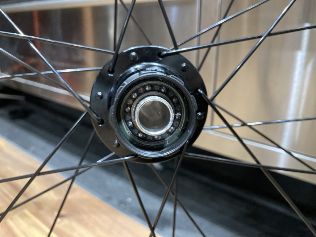 ホイールはベアリングの状態を確認するために分解。工場でのグリスが少なかったり、グリスの劣化が見られた場合はこちらで再塗布を行います。またカップアンドコーン式ベアリングの際は回転性能の向上とベアリングボールの摩耗を最小限に抑えるために丁寧に玉押し調整を行います。