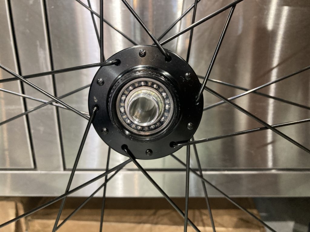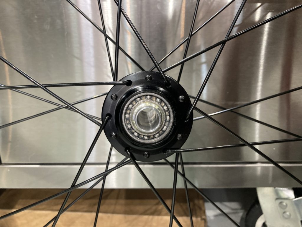 ホイールはベアリングの状態を確認するために分解。工場でのグリスが少なかったり、グリスの劣化が見られた場合はこちらで再塗布を行います。またカップアンドコーン式ベアリングの際は回転性能の向上とベアリングボールの摩耗を最小限に抑えるために丁寧に玉押し調整を行います。