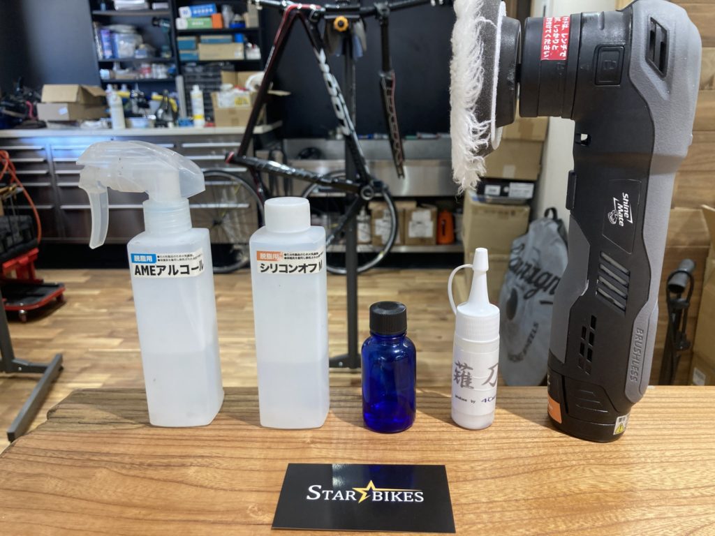 クレストヨンド社によるガラスの鎧(青色の瓶)、カミナリの鎧(黒色の瓶)と専用の研磨機(右端) STAR☆BIKESでは車体購入時やオーバーホール受付時にフレームへのコー...
