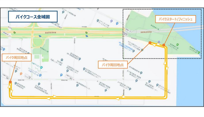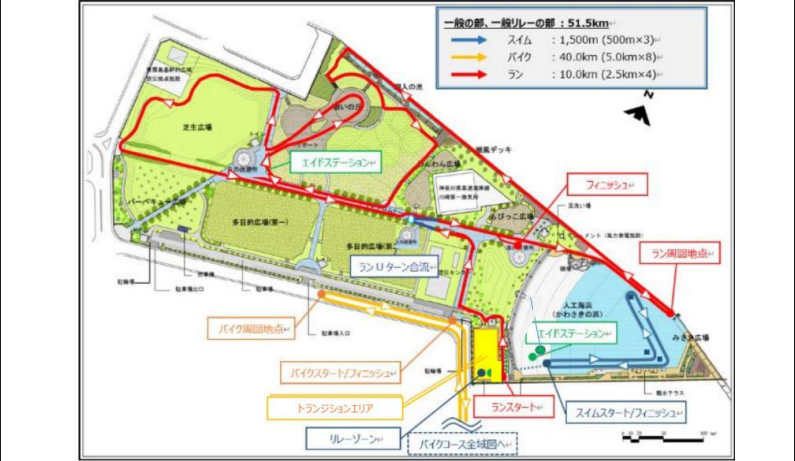 ランコース:「東扇島東公園」を大きく使用する1周2.5kmのコース。3m幅くらいの桟橋での折り返しがコースに含まれるが、とてもタイト。周回最後の直線は序盤が芝生でさらに約4%の勾配が付いている。