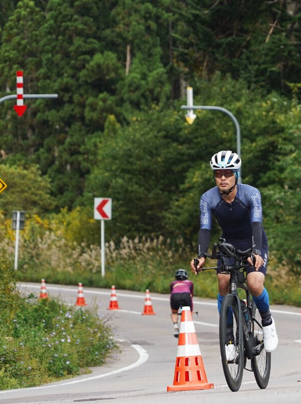 私が好きなのは山岳コースの下り坂です。眼下に広がる絶景を眺めつつ風を切る爽快感は、ロードバイクならではのご褒美。バイクパートは交通制限を行っているので、コース幅をいっぱいに使用して安心して駆け抜けることができます。人工的な空間ではなく、自然そのものがフィールドになるのがトライアスロンの魅力です。