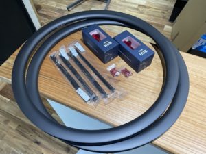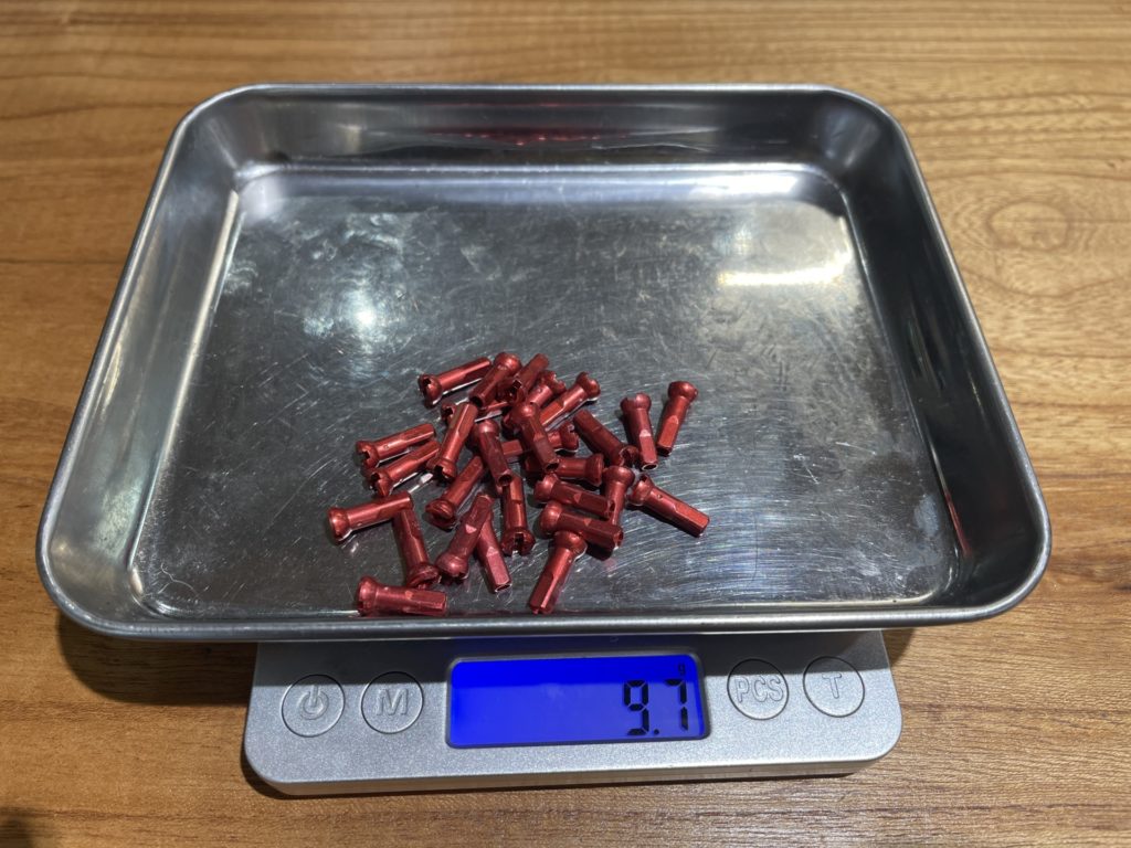 元の仕様ではDT SWISS P1800アルミホイール、BRIDGESTONE EXTENZAタイヤ、ブチルチューブの仕様で8.93kgでした。