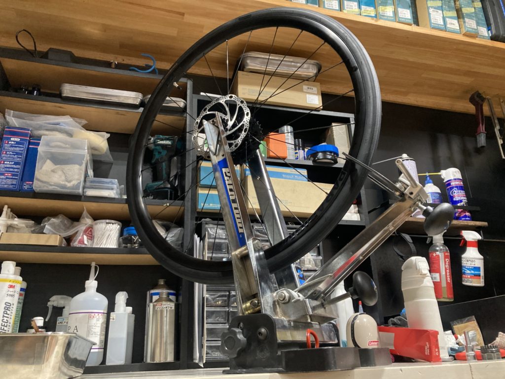 ホイールはベアリングの状態を確認するために分解。工場でのグリスが少なかったり、グリスの劣化が見られた場合はこちらで再塗布を行います。またカップアンドコーン式ベアリングの際は回転性能の向上とベアリングボールの摩耗を最小限に抑えるために丁寧に玉押し調整し、最後に振れ取り作業を行います。