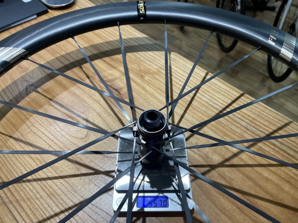 今回選んだEVO S5ですが、リムハイト50mm、内幅24mm、ホールレスリムと今時な仕様に5.0mmブレード自社設計カーボンスポーク採用で重量は実測でフロント557gリア653gで合計1210g!
