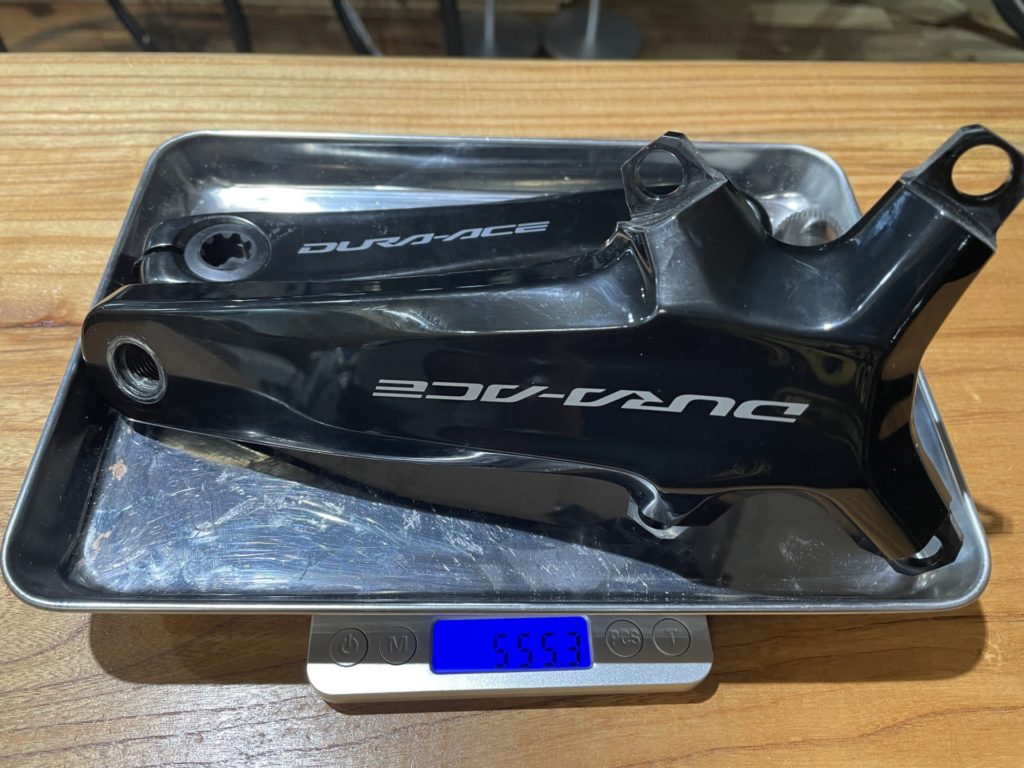 実際にシマノのパワーメーター無しクランクであるFC-R9200を計測したところ実測重量は555.3g。