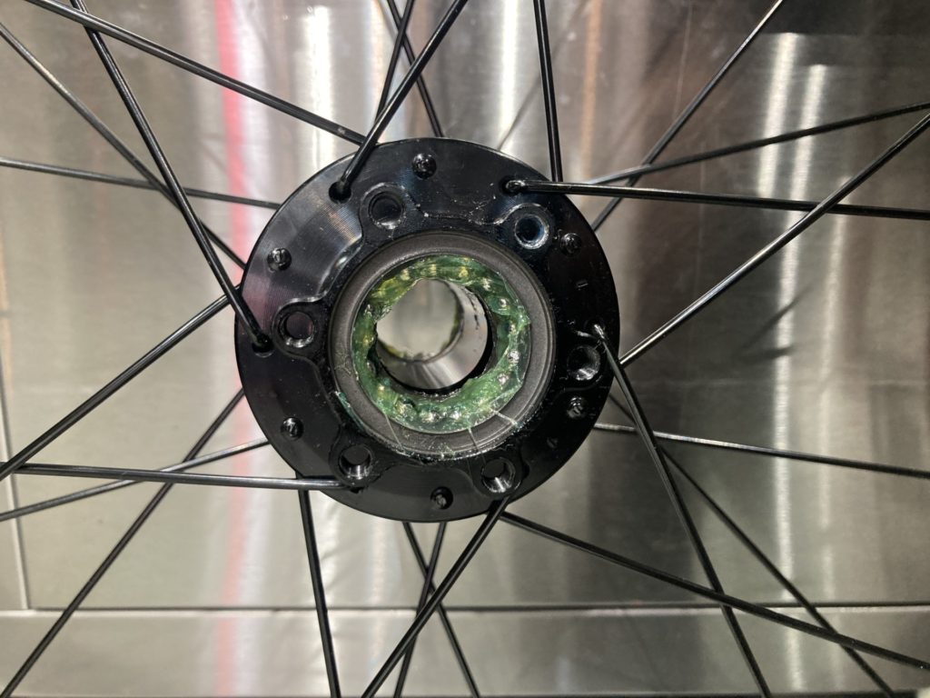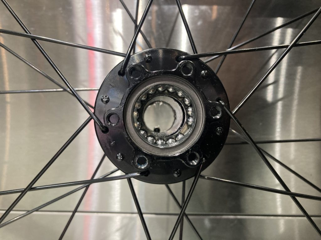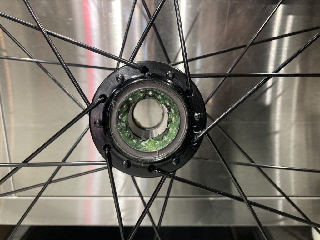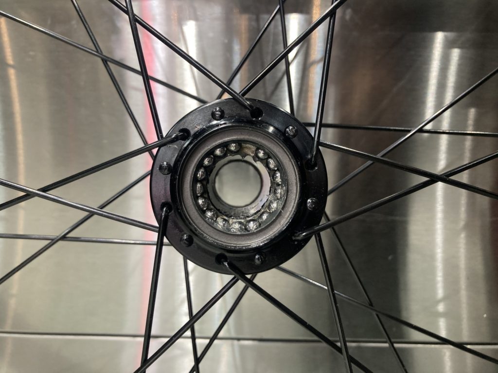 ホイールはベアリングの状態を確認するために分解。工場でのグリスが少なかったり、グリスの劣化が見られた場合はこちらで再塗布を行います。またカップアンドコーン式ベアリングの際は回転性能の向上とベアリングボールの摩耗を最小限に抑えるために丁寧に玉押し調整し、最後に振れ取り作業を行います。