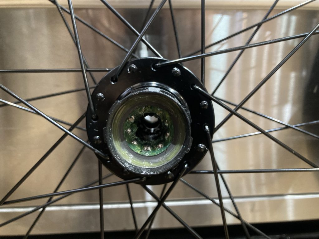 ホイールはベアリングの状態を確認するために分解。工場でのグリスが少なかったり、グリスの劣化が見られた場合はこちらで再塗布を行います。またカップアンドコーン式ベアリングの際は回転性能の向上とベアリングボールの摩耗を最小限に抑えるために丁寧に玉押し調整を行います。