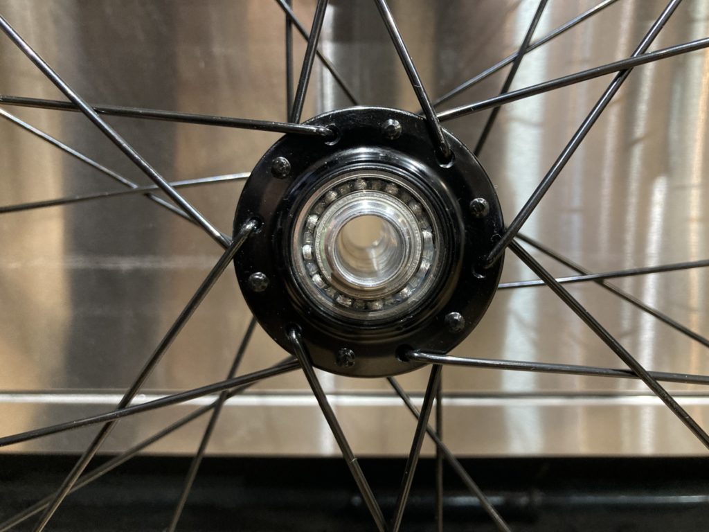 ホイールはベアリングの状態を確認するために分解。工場でのグリスが少なかったり、グリスの劣化が見られた場合はこちらで再塗布を行います。またカップアンドコーン式ベアリングの際は回転性能の向上とベアリングボールの摩耗を最小限に抑えるために丁寧に玉押し調整を行います。