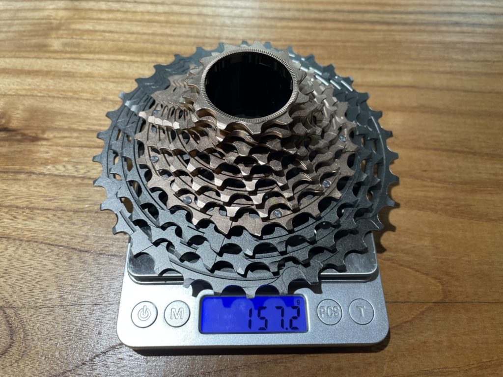 スプロケット本体が157.2g、アルミニウム製ロックリングが5.7gで合計は162.9gでした。